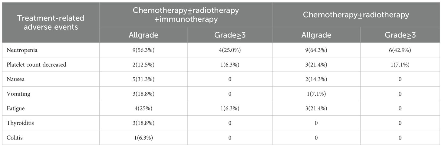 The most common adverse events (AEs) were neutropenia (Arm A: 64.3% vs Arm B: 56.3%) and nausea (Arm A: 14.3% vs Arm B: 31.3%). The rate of grade 3–4 neutropenia was 42.9% in Arm A compared to 25.0% in Arm B. Compared with Arm A, the addition of ICIs was associated with an increase in grade 1–2 immune-related adverse events (irAEs), with an incidence rate of 25.0% (including 3 cases of thyroiditis and 1 case of colitis) (Table 5).