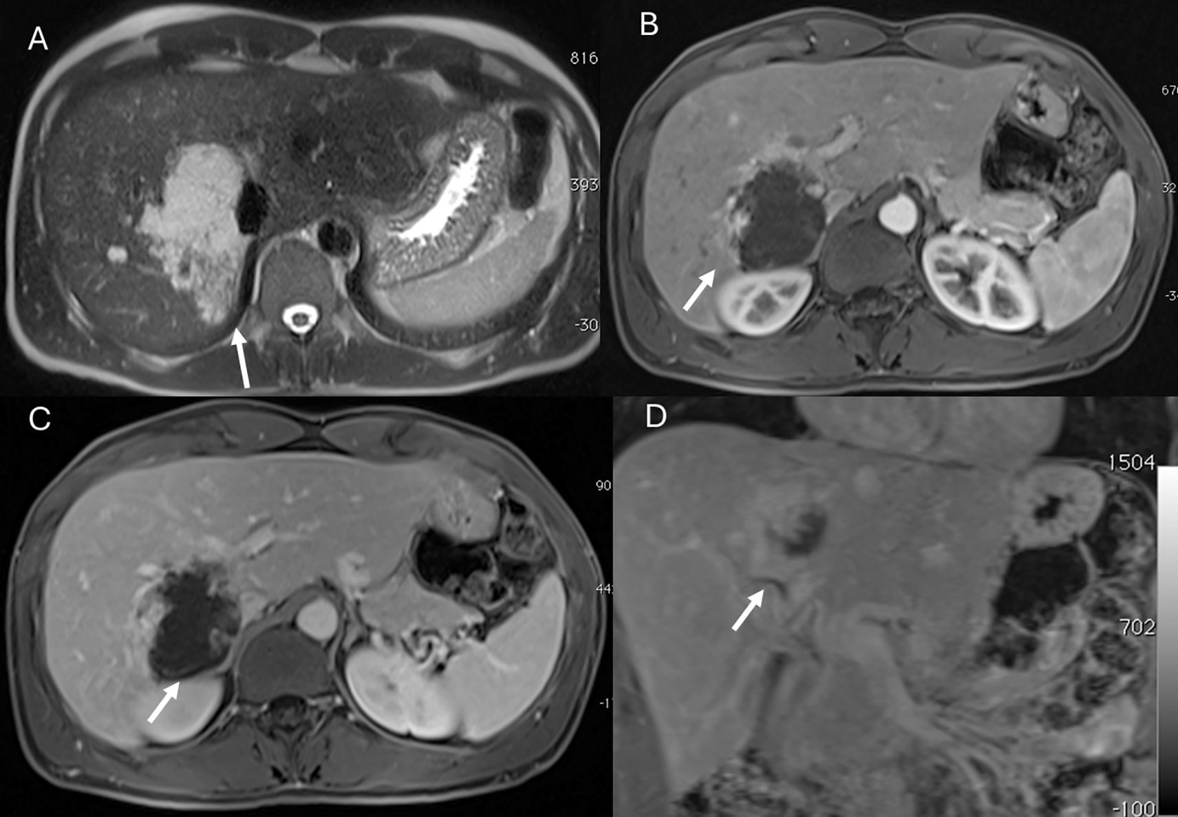 Figure 1. MRI assessment of liver hemangiomas (arrows). In (A) (T2-W sequence, axial plane), the hemangioma (arrow) shows hyperintense signal, and after non-specific contrast agent administration a progressive enhancement is seen (B) T1-W in axial plane during in arterial phase; (C) T1-W in axial plane during portal phase and (D) T1-W in coronal plane during late phase).