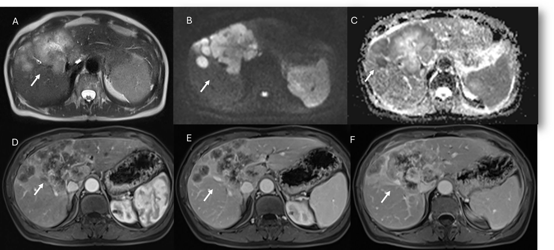 Figure 2. MRI assessment of non-mucinous colorectal liver metastases (arrows). In (A) (T2-W sequence, axial plane), the lesion (arrow) shows hyperintense signal with restricted diffusion on b = 880 s/mm² (B) and targetoid appearance on ADC map (C). After non-specific contrast agent, rim enhancement is seen in the arterial phase (D, T1-W, axial), with peripheral enhancement in the portal (E) and late phases (F) showing targetoid appearance from central necrosis.