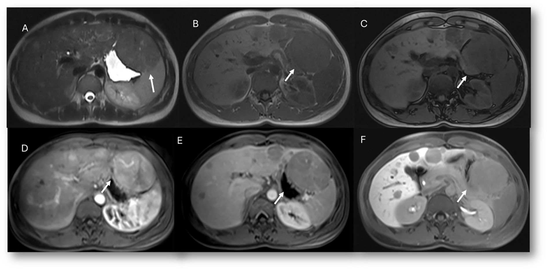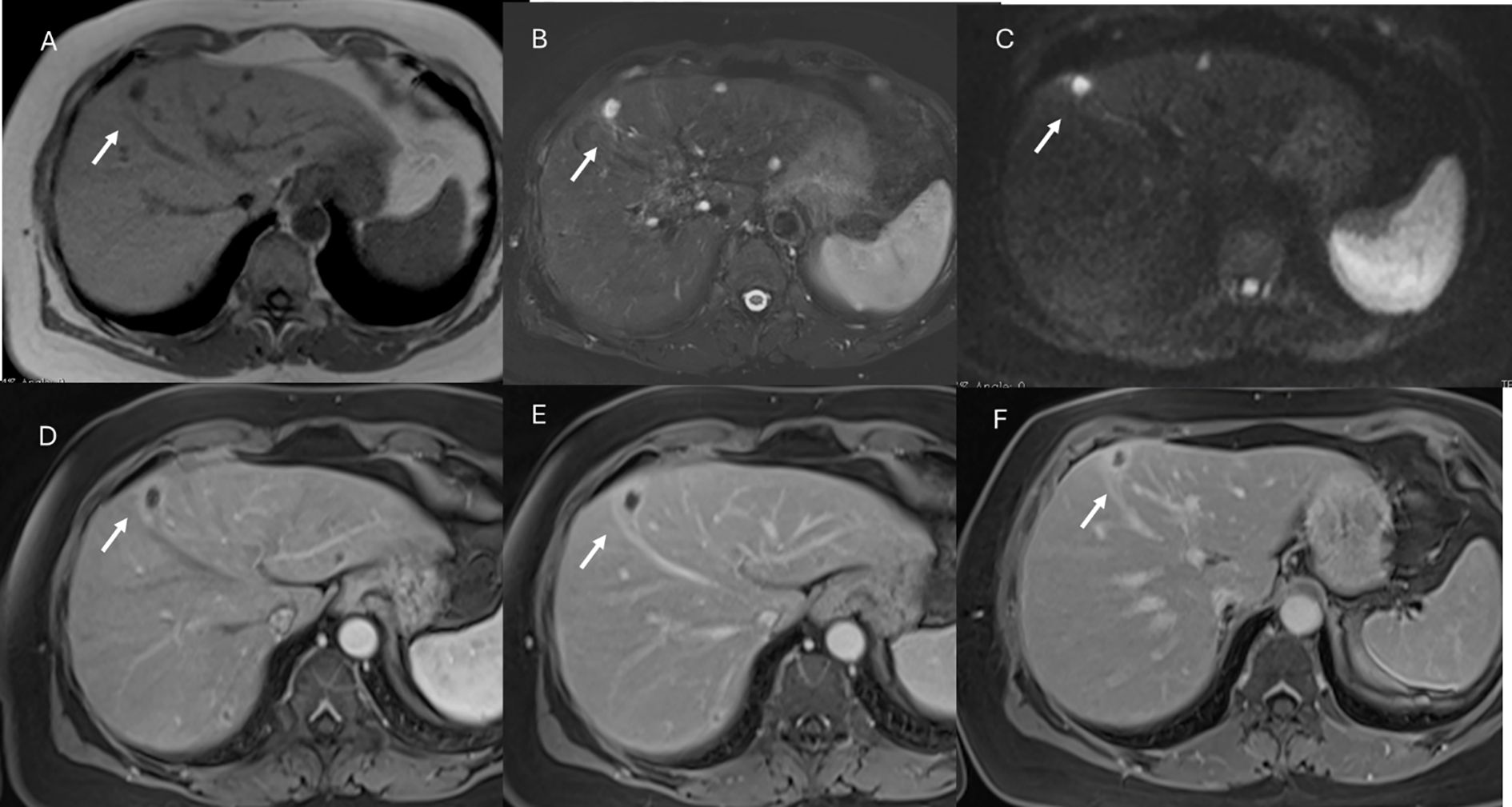 Figure 8. MRI assessment of multiple adenoma lesions (arrows) with Gd-EOB-DTPA contrast. In (A) (T2-W sequence), lesions are hyperintense; in (B) (T1-W in-phase) and (C) (T1-W out-of-phase), lesions are hypointense. During contrast study, lesions show non-rim hyperenhancement during arterial phase (D), washout during portal phase (E), and hypointense signal on hepatospecific phase (F).