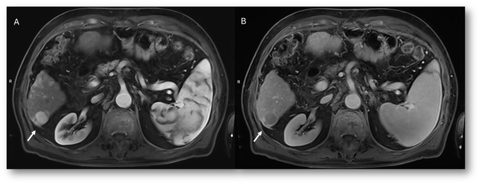 Figure 4. MRI assessment of HCC (arrows). Contrast evaluation with non-specific contrast agent. In (A) and (B) (T1-W FS sequences, axial plane), the lesion shows APHE during arterial phase (A) and washout in portal phase (B), with capsule appearance. These are typical major features according to LI-RADS v2018.