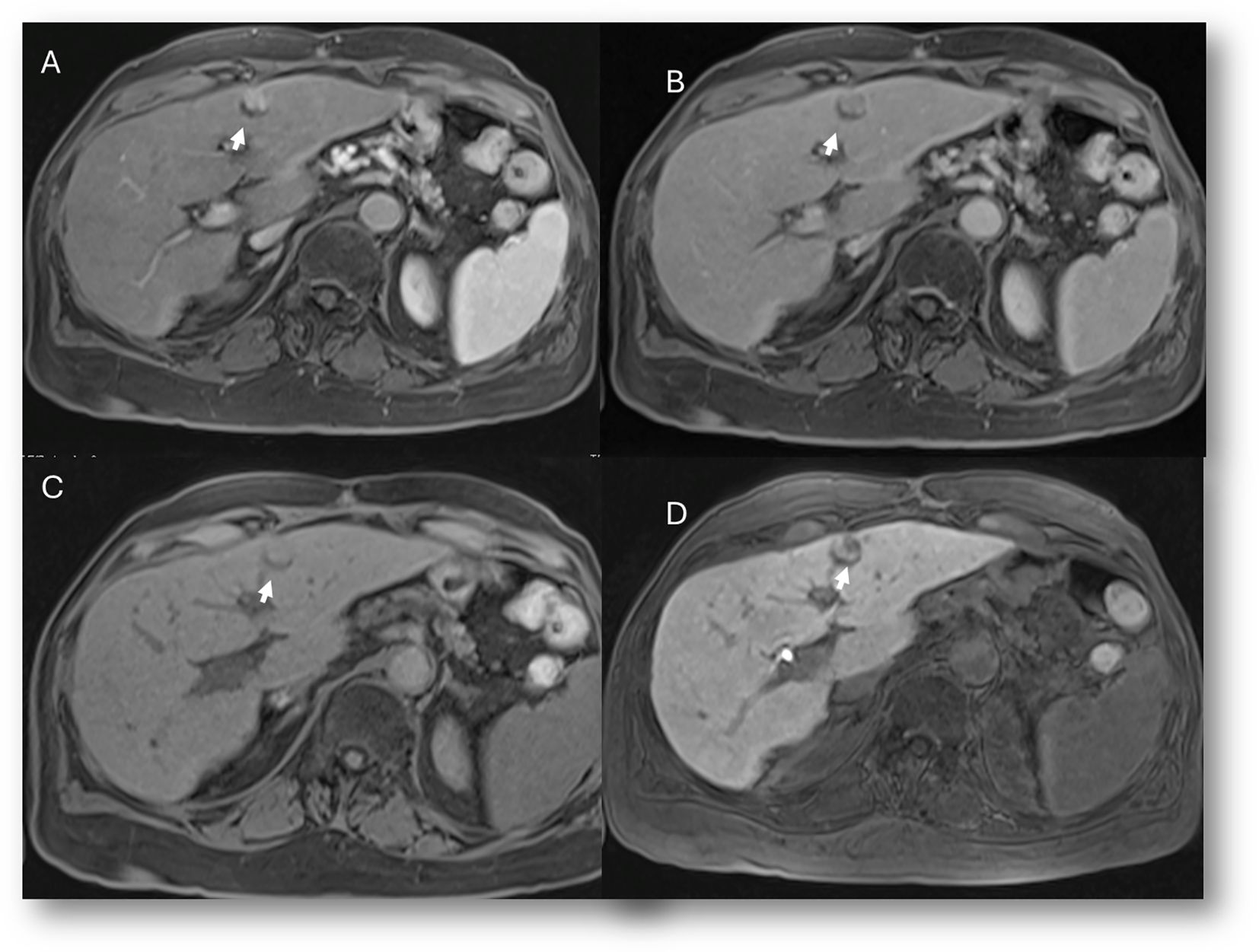Figure 5. MRI assessment of nodule-in-nodule in early HCC (arrows). Contrast study with specific agent (Gd-EOB-DTPA). In (A) (T1-W FS sequence, axial plane), the lesion shows APHE during arterial phase, while during portal (B) and transitional phases no washout is present. (C) Only the nodule-in-nodule shows hypointense signal in the hepatospecific phase (D).