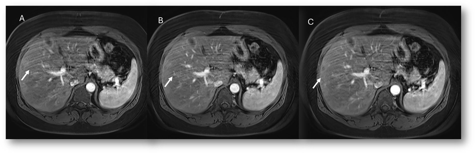 Figure 6. MRI assessment of colorectal liver metastases with Gd-EOB-DTPA contrast during multi-arterial phase: motion artifacts on all phases with low image quality. (A–C) Sequence acquired on 3T VIDA System (Siemens, Germany) with deep learning AI technology.