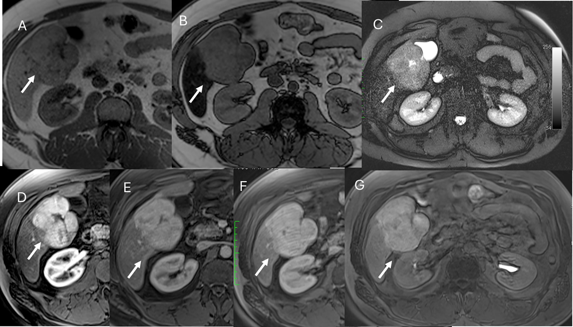 Figure 7. MRI assessment of FNH lesion (arrows) with Gd-EOB-DTPA contrast. In (A) (in-phase) and (B) (out-phase), the lesion shows hypointense signal with central scar and steatosis of the liver parenchyma in (B). In C (T2-W FS sequence), the lesion is hyperintense with central scar. During contrast study, the lesion shows non-rim hyperenhancement during arterial phase (D), no washout during portal (E) or transitional (F) phases, and hyperintense signal on hepatospecific phase (G).