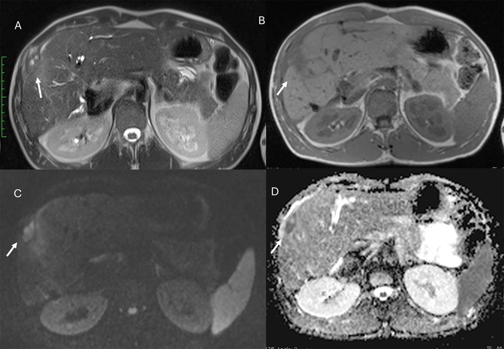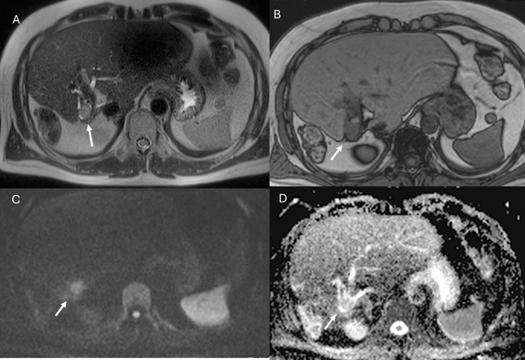 Figure 9. MRI of liver abscess after surgical resection. The lesion (arrows) shows hyperintense signal in T2-W sequence (A), hypointense signal in T1-W sequence (B), restricted diffusion on b = 800 s/mm² (C), and hypointense signal on ADC map (D). This demonstrates that a benign lesion can also show restricted signal and hypointensity on ADC maps.