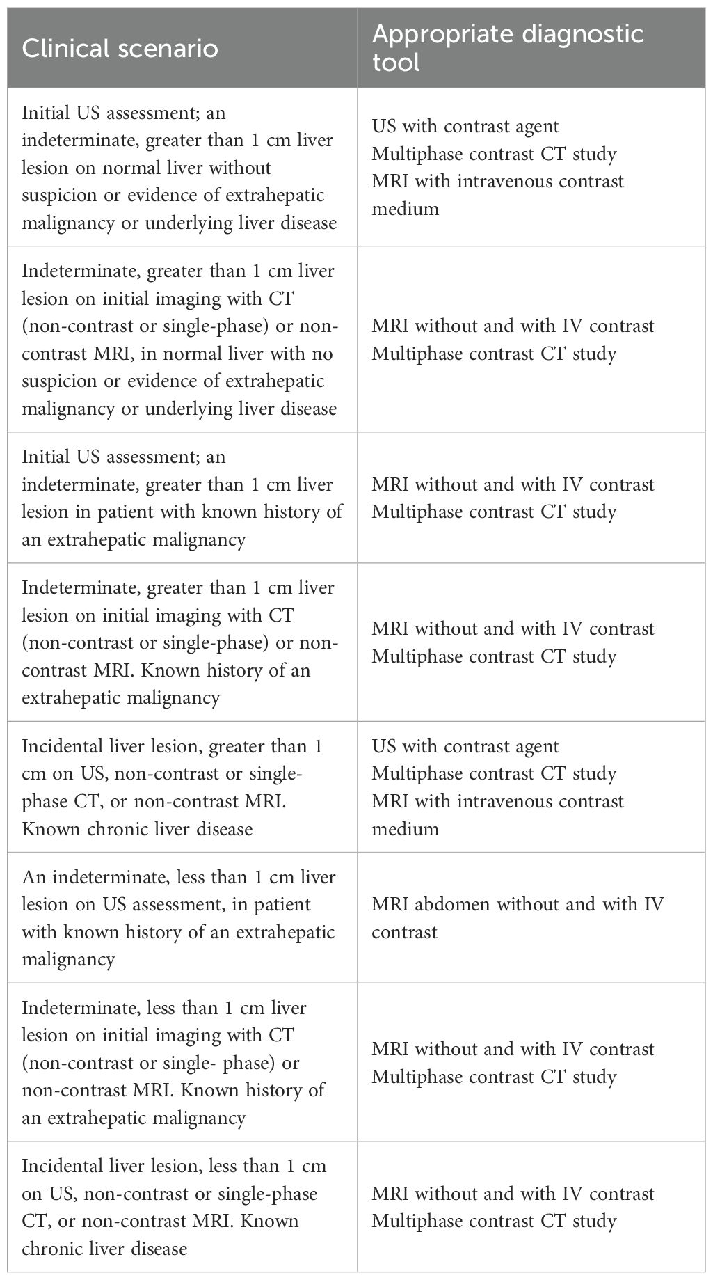 For scenario 6, characterized by an indeterminate liver lesion <1 cm on US assessment in a patient with a known history of extrahepatic malignancy, only abdominal MRI without and with IV contrast is considered appropriate. In contrast, for scenario 7 (indeterminate liver lesion <1 cm on initial imaging with CT [non-contrast or single-phase] or non-contrast MRI in a patient with a known history of extrahepatic malignancy) and scenario 8 (incidental liver lesion <1 cm on US, non-contrast or single-phase CT, or non-contrast MRI in a patient with known chronic liver disease), either abdominal MRI without and with IV contrast or abdominal CT with multiphase IV contrast are appropriate.