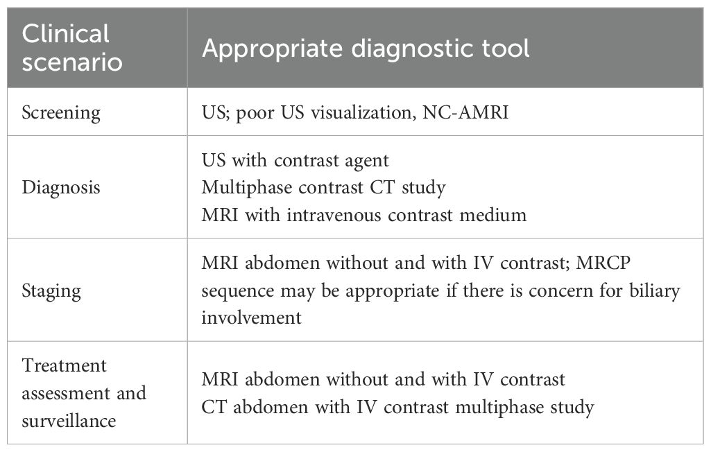 The recommended diagnostic tools for HCC are contrast-enhanced US (CEUS), multiphase CT, multiphase MRI with extracellular contrast agents (ECA), and multiphase MRI with hepatobiliary agents (HBA) (18). Several studies suggest that MRI offers higher sensitivity with similar specificity compared to CEUS or multiphase CT (18). However, the choice of diagnostic tool must be individualized, considering patient factors such as breath-holding capability, claustrophobia, body habitus, renal function, and comorbidities (e.g., allergies). Institutional factors, including technology availability and expertise, also play a role (18).