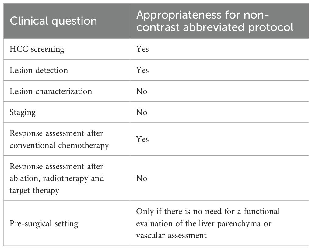 An abbreviated protocol without contrast medium or dynamic study would not seem applicable (Table 3) when there is a need to characterize a lesion, to evaluate response to targeted therapies, radiotherapy, or ablative treatments, to stage lesions for proper vascular assessment, or to conduct pre-transplant liver evaluation (86–89). Nevertheless, there is an evident need for new and more robust scientific evidence to support this thesis.