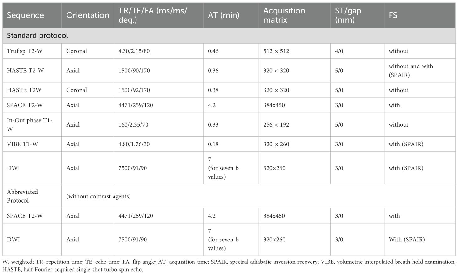 Table 4. Examples of standard and abbreviated MR sequence parameter protocols for liver metastases detection in our institution at 1.5 T.