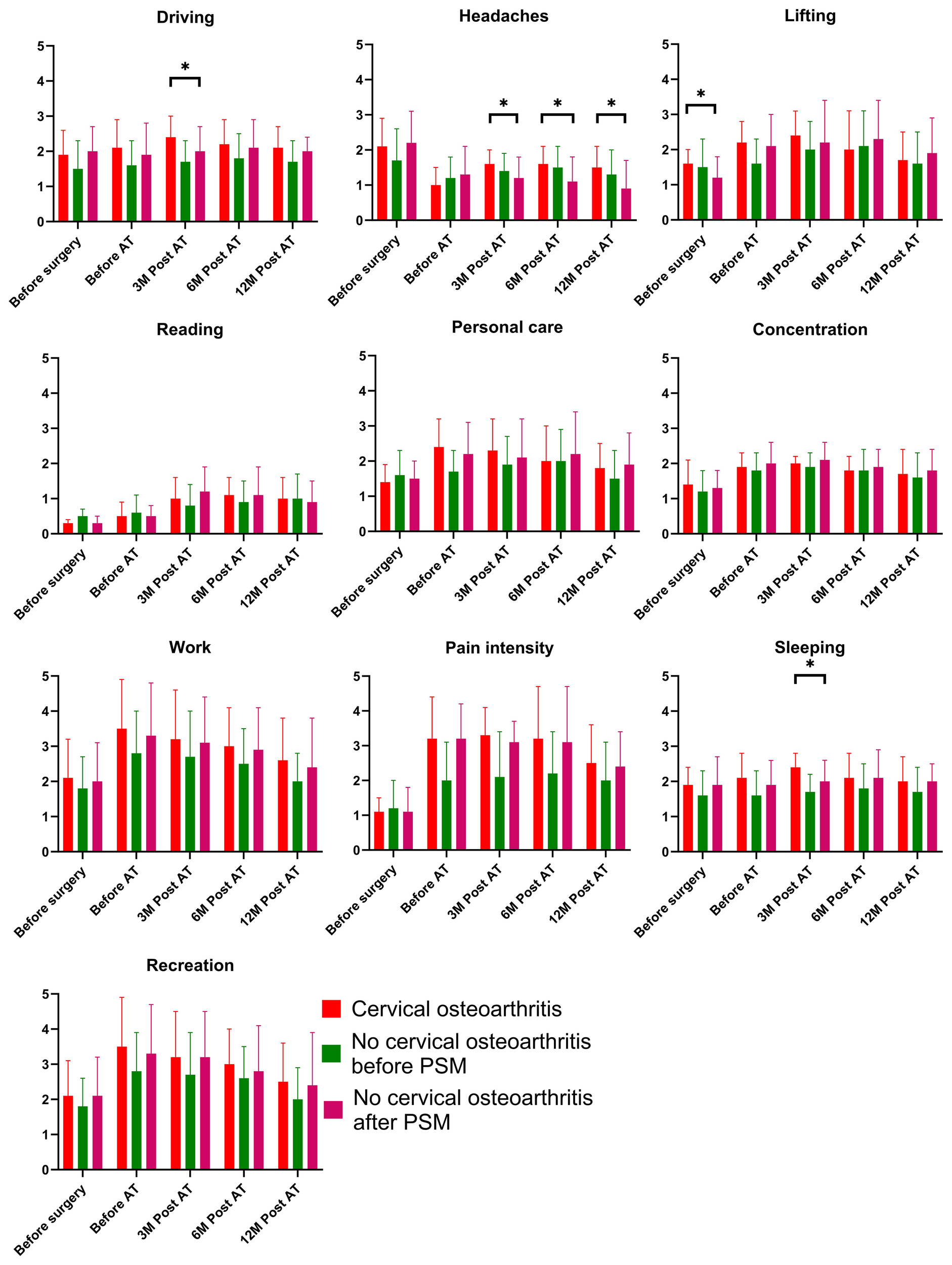 In summary, while cervical osteoarthritis was associated with transient postoperative impairments in driving, sleeping, and swallowing, these functional limitations typically resolved within the early recovery period. Persistent fatigue alongside sustained emotional resilience highlight the complex interplay between physical and psychosocial adaptation in this patient population. Importantly, our results demonstrate that cervical osteoarthritis subtype has minimal impact on long-term quality of life, suggesting that preoperative counseling should focus more on functional expectations than diagnostic classification. These findings underscore the importance of targeted rehabilitation strategies and patient-centered communication to optimize recovery in cervical osteoarthritis patients undergoing complex head and neck reconstruction.
