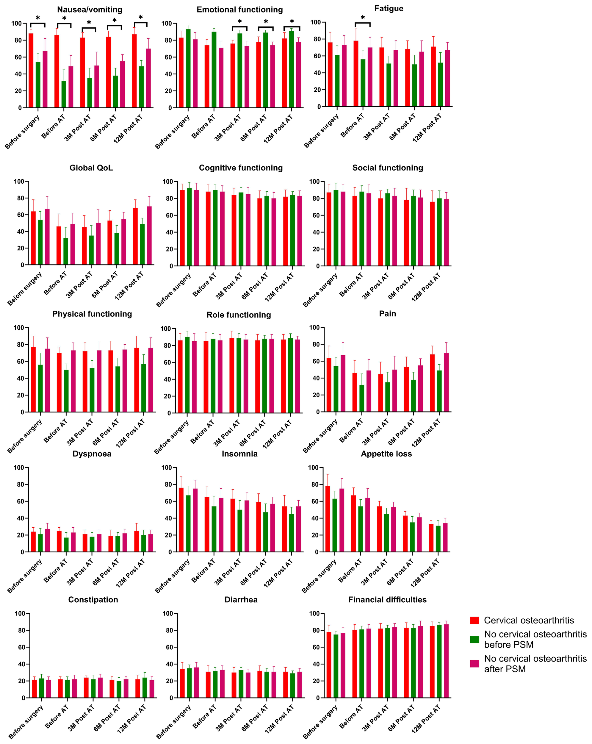 A total of 60 patients were analyzed. At baseline, cervical osteoarthritis was associated with lifting dysfunction (p=0.004) and nausea/vomiting (p<0.05). Postoperatively, transient impairments in driving, sleeping, and swallowing were noted in the osteoarthritis group, particularly within 3 months (p<0.05). Persistent fatigue was reported, but emotional function scores were superior in this group (p<0.05). No significant differences in QoL were observed based on osteoarthritis subtype. Response rates declined over time, primarily due to cancer recurrence.