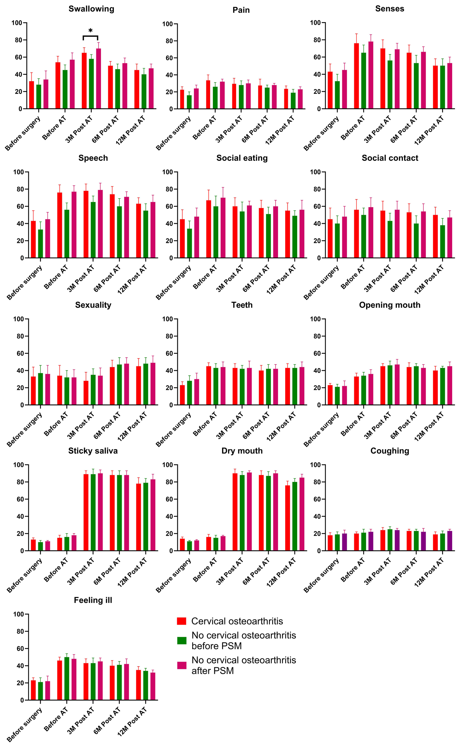 At baseline, all items scored similarly between the cervical osteoarthritis and non-cervical osteoarthritis groups after PSM. However, patients with cervical osteoarthritis demonstrated higher swallowing scores at 3 months post-adjuvant therapy compared to those without cervical osteoarthritis. No other significant differences were observed between the two groups (Figure 3).
