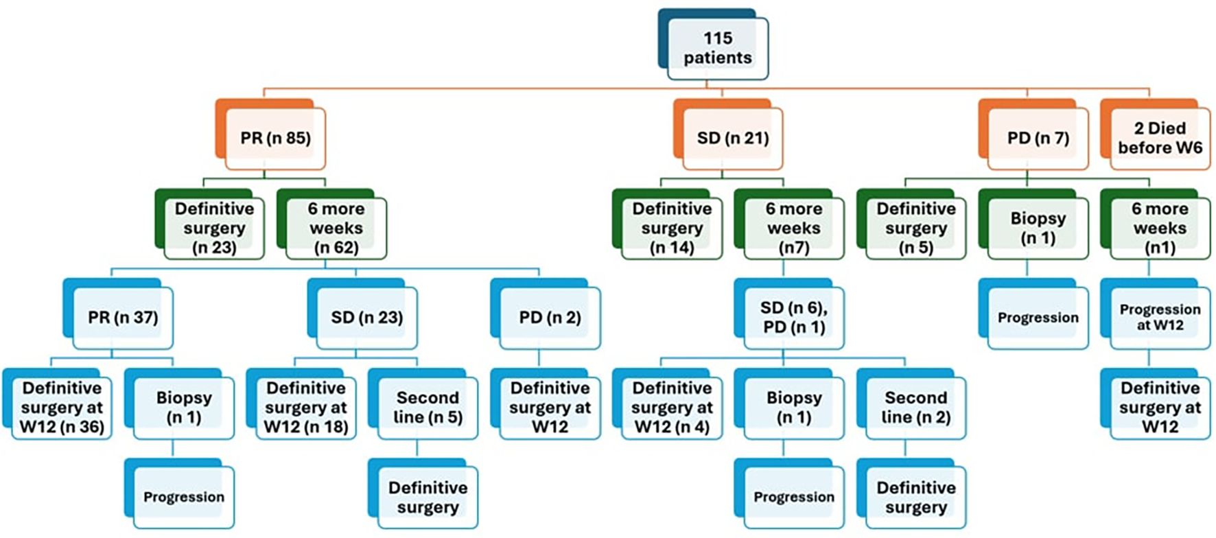 Among 85 patients with PR at the week 6 evaluation, 62 patients (72.9%) received an additional 6 weeks of chemotherapy, with 59.5% of these patients (37/62) achieved further tumor regression. In contrast, none of the patients with SD (7/21) or PD (1/7) at the week 6 evaluation exhibited regression after addition of 6 more weeks of neoadjuvant chemotherapy underscoring the importance of local control rather than further chemotherapy for those who didn’t achieve a good response after 6 weeks of neoadjuvant chemotherapy.