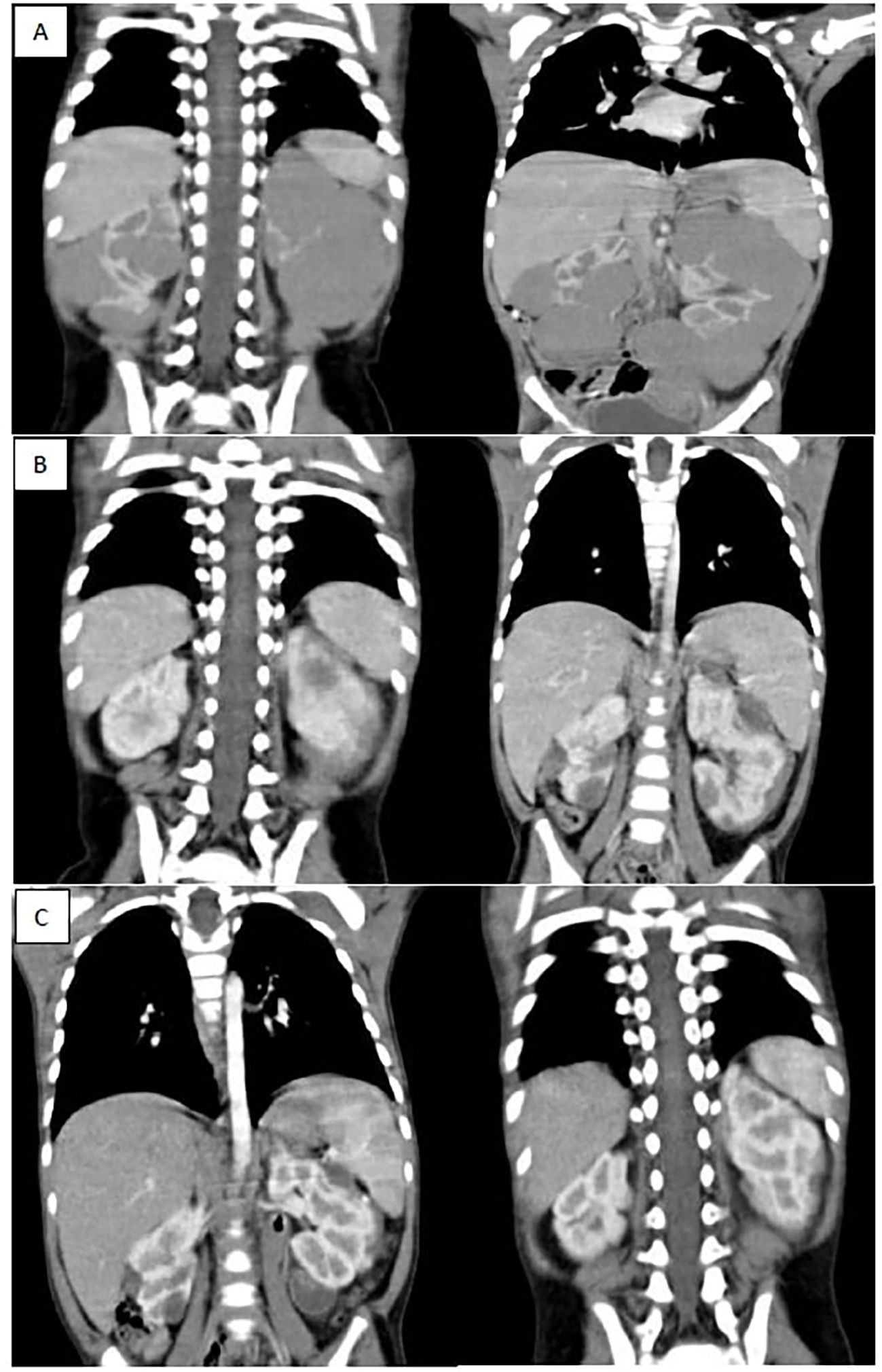 Figure 2. (A) shows bilateral renal masses with the left kidney diffusely infiltrated with a huge mass while the right kidney shows multiple variable sized mass lesions, (B) shows marked regression of the bilateral renal masses after 6 weeks of neoadjuvant chemotherapy (average 90 % reduction of target lesions), (C) shows further regression of bilateral renal masses after 12 weeks of neoadjuvant chemotherapy.