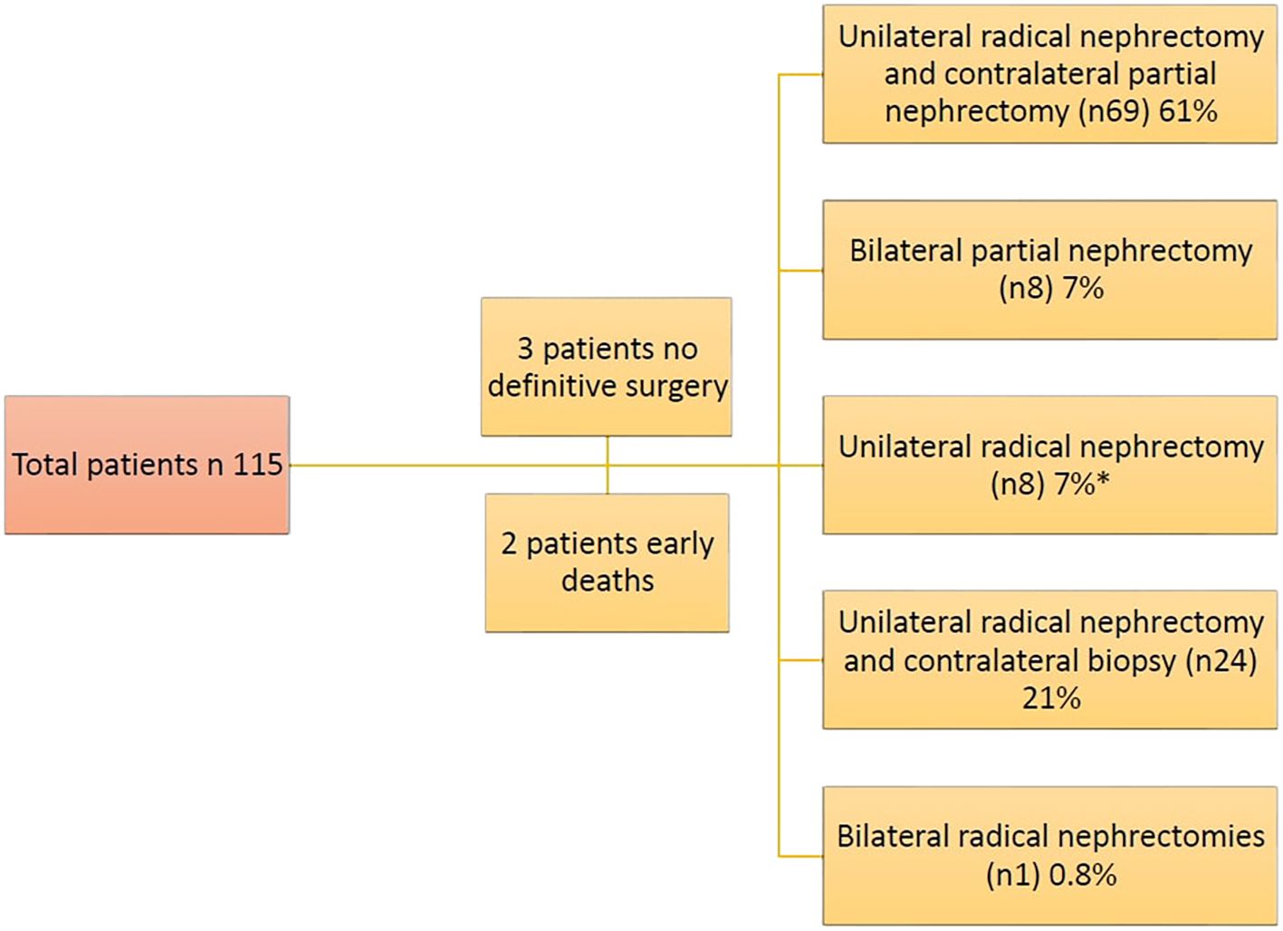 Figure 3. Types of surgical approaches for bilateral Wilms’ tumors in our cohort (* Intraoperative US showed a scar with no residual mass (achieved CR in one kidney)).