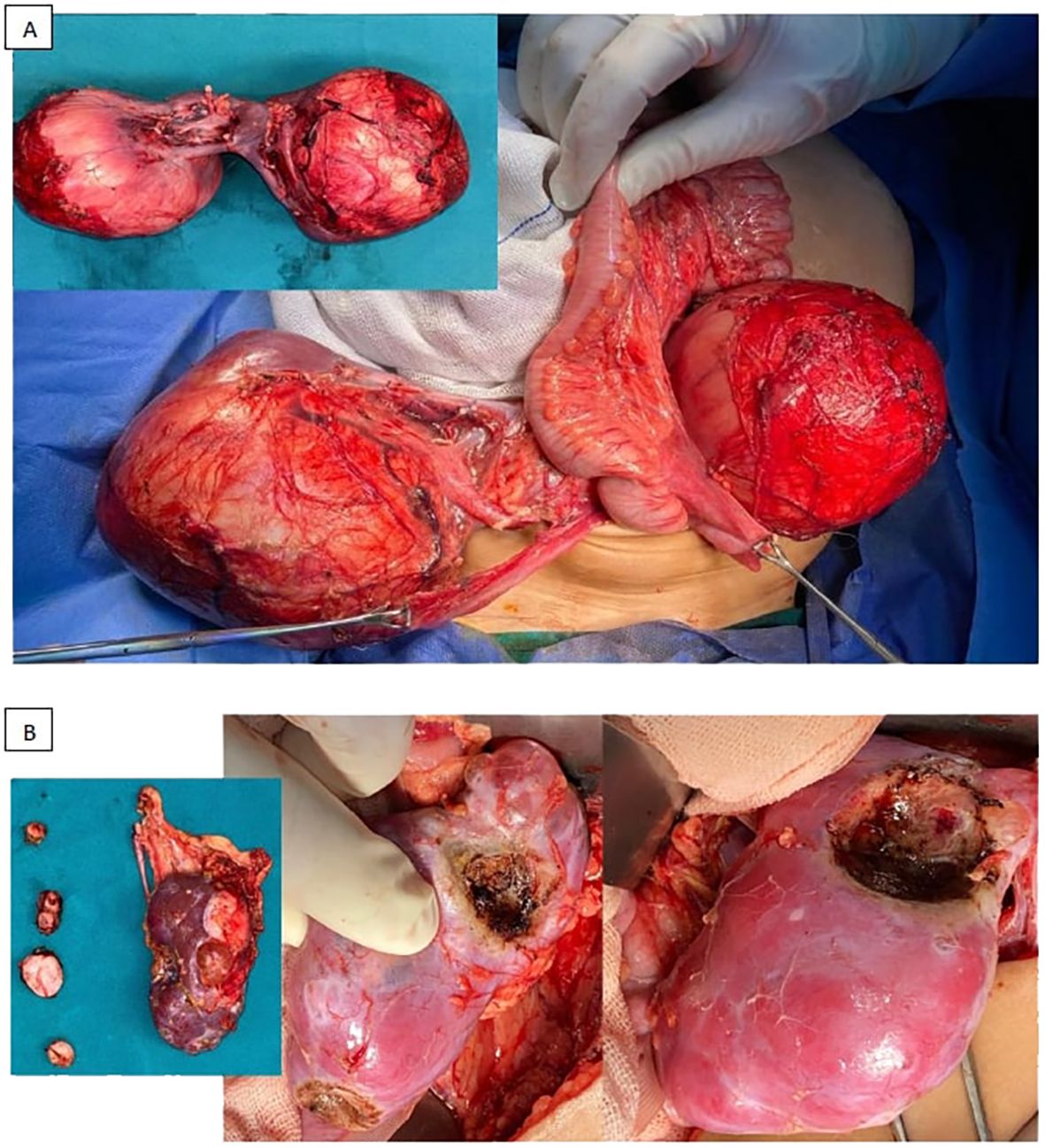 Figure 4. Examples for different surgical approaches [(A) bilateral radical nephrectomies, (B) radical nephrectomy and NSS (in the form of multiple enucleations)].