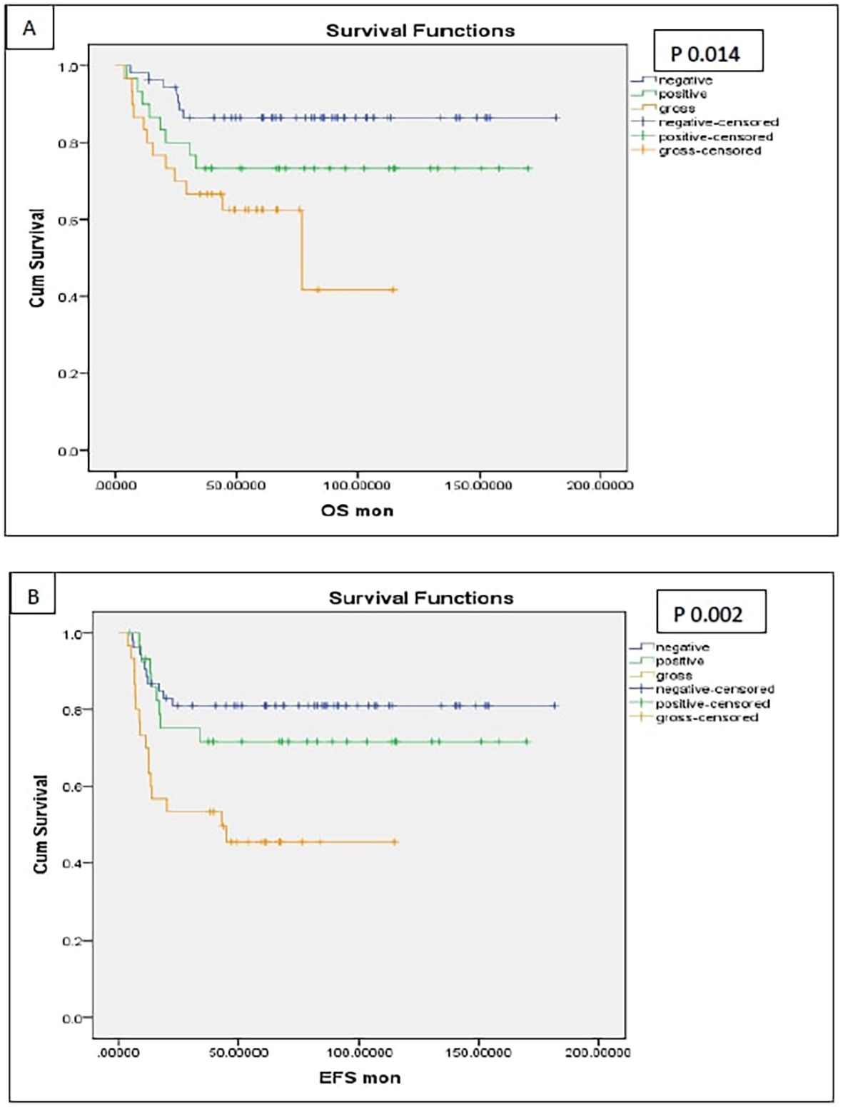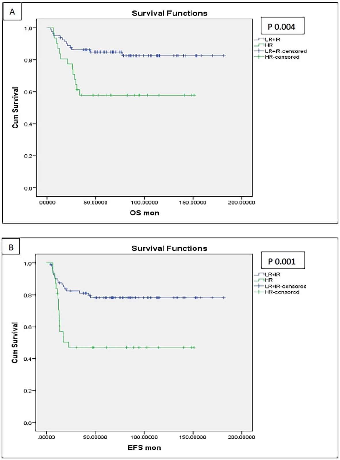 Figure 6. Survival of the patients with high-risk pathology (anaplasia and blastemal) [(A) OS, (B) EFS].