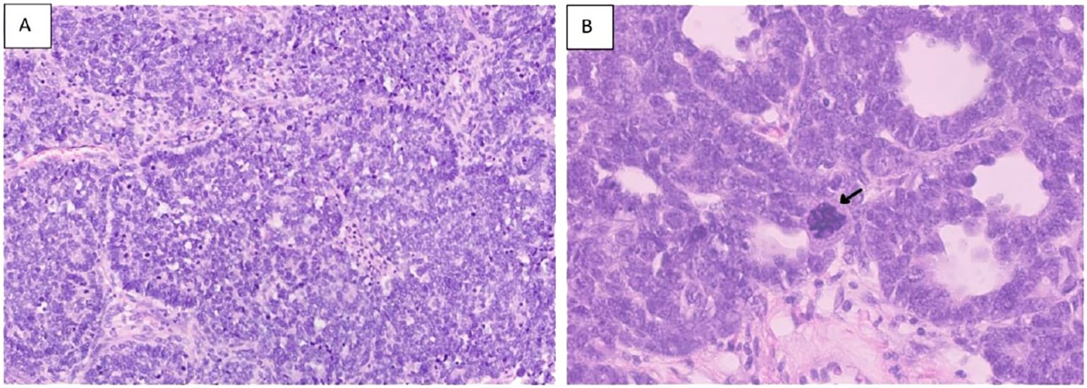 Figure 7. Hematoxylin and eosin stains [(A) section showing predominance of primitive cells with hyperchromatic nuclei and scanty cytoplasm (Blastemal predominance) X20.] [(B) showing large anaplastic cell with large hyperchromatic multipolar mitotic figure (arrow) 40X].