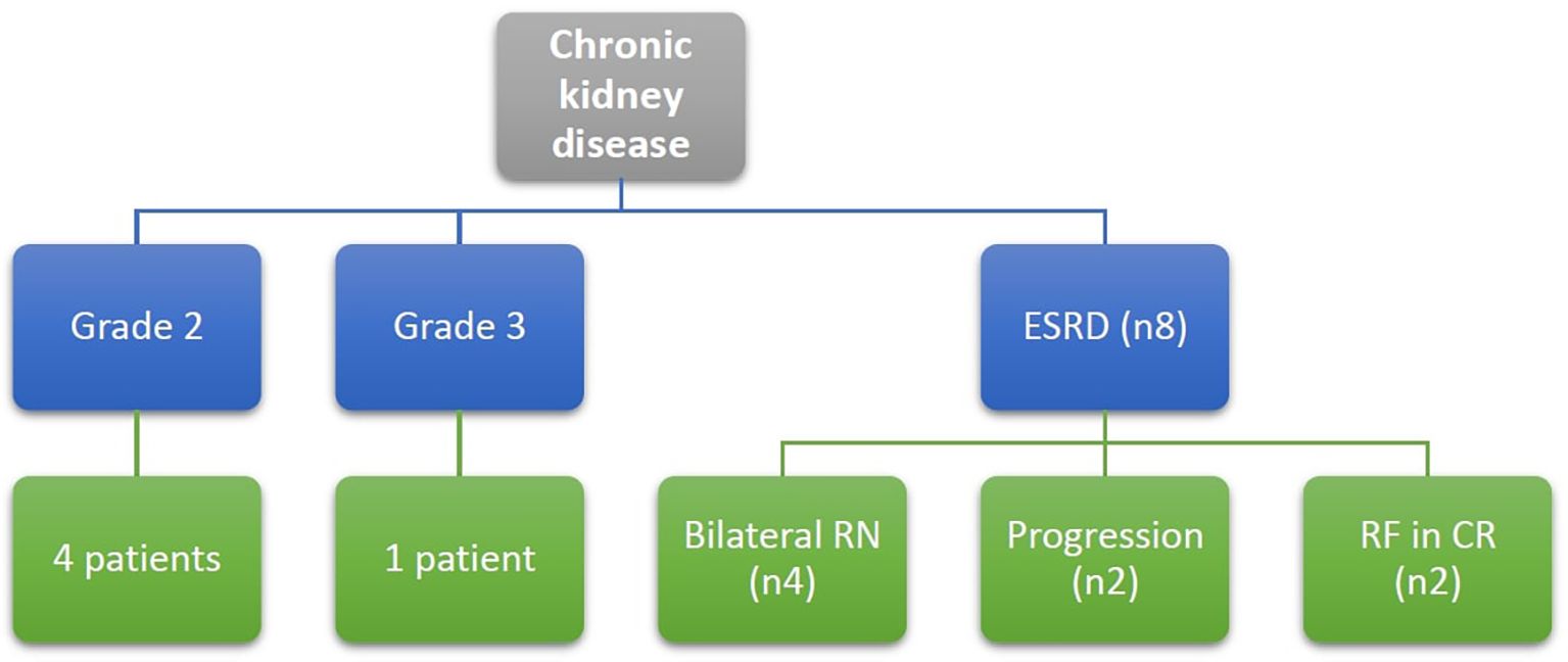 Figure 8. Patients with chronic kidney disease at end of the study defined according to CTCAE version 5, Grade 2: eGFR 59-30 ml/min/1.73m2, Grade 3: eGFR 29-15 ml/min/1.73m2, ESRD: eGFR below 15 ml/min/1.73m2, RF, renal failure; RN, radical nephrectomy.
