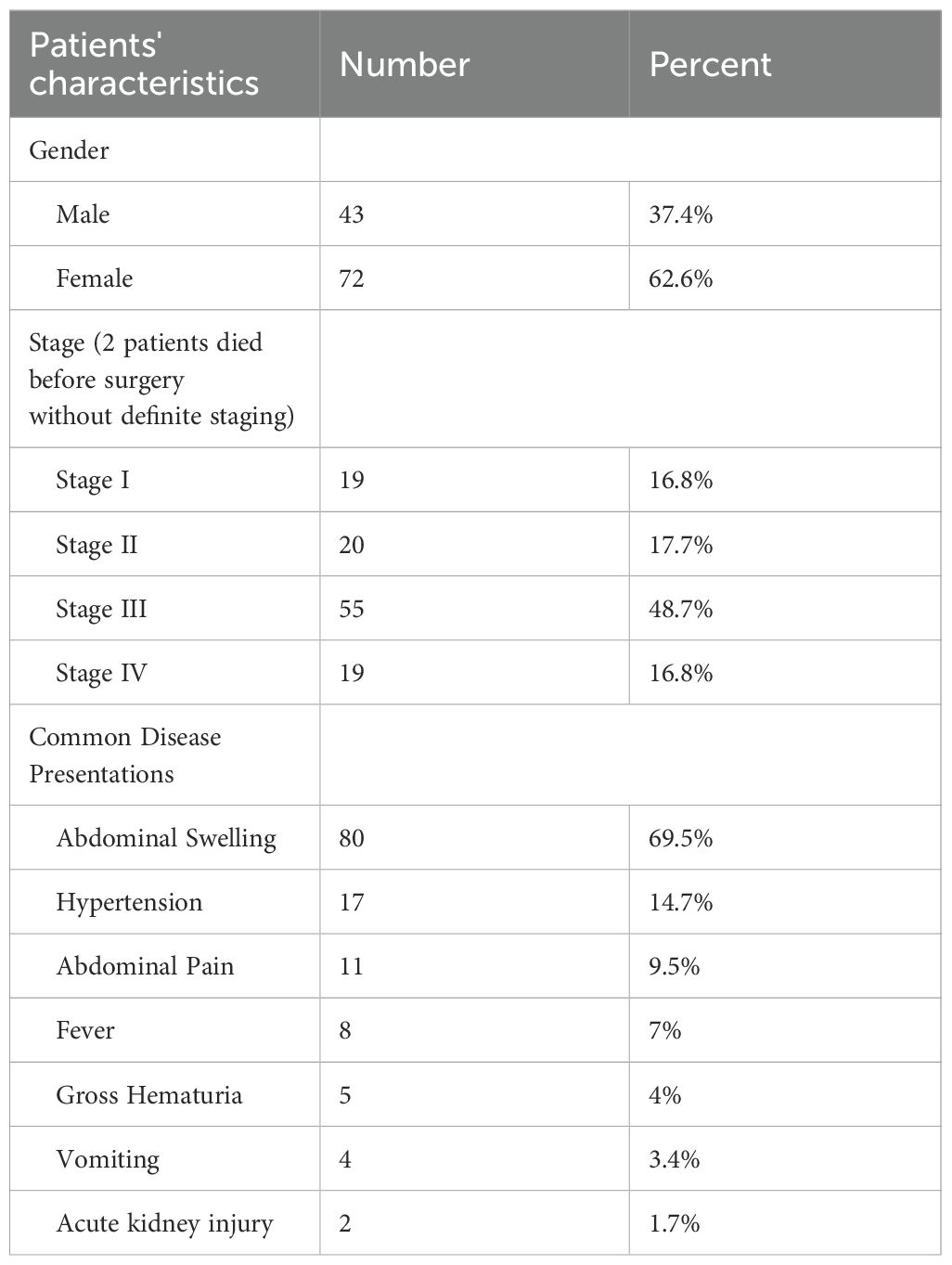 Table 1 illustrates the clinical characteristics of the included patients. Out of the 115 patients included, 43 were males with a male to female ratio of 1:1.67 and the mean age was 31.5 months (range 3 months – 9 years). Abdominal swelling/mass was the most common presenting sign and symptom reported in 80 patients (69.5%), followed by hypertension 17 (14.7%) which were discovered during routine assessment of vital signs and clinical examination. Gross hematuria was observed in 5 patients (4%). Congenital anomalies/syndromes were clinically detected in 19 patients (16.5%) (Table 2).