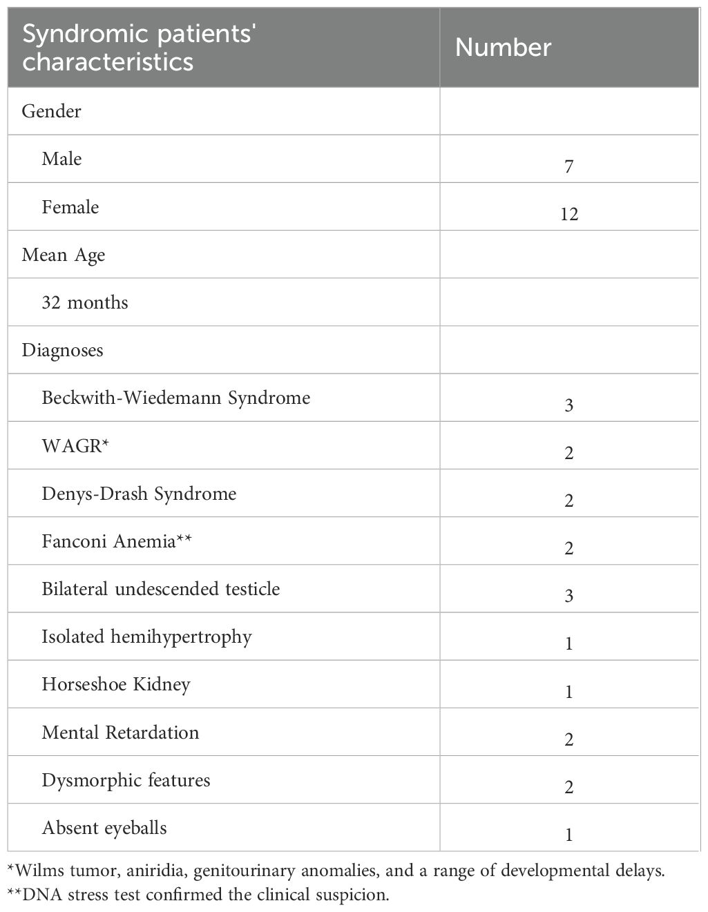 In multivariate analysis, syndromic status was identified as a significant independent predictor of OS, alongside high-risk pathology. This underscores the critical need for enhancing supportive care in syndromic patients. A report from SIOP WT 2001 Study showed that 6 patients with Denys Drash syndrome had ESRD, and bilateral nephrectomy was performed for them.