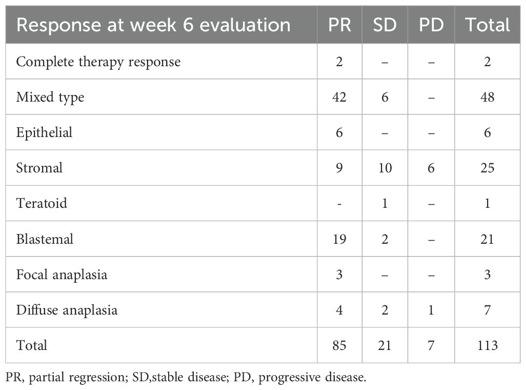 Correlation between radiological response to neoadjuvant chemotherapy and histopathologic subtypes revealed that approximately 50% of patients with SD (10 out of 21) and nearly all patients with PD (6 out of 7) at week 6 evaluation, exhibited stromal predominance. These findings align with established patterns of poor chemoresponsiveness in stromal-dominant tumors, as evidenced by the COG AREN0534 trial, where 18 of 21 patients with stromal pathology failed to achieve PR post-chemotherapy. Notably, survival rates remained consistent regardless of treatment responses or disease stages within each histologic category (24).