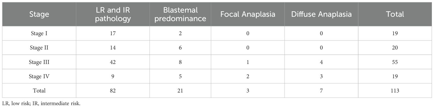 Adjuvant chemotherapy and radiotherapy were determined according to the higher stage and more aggressive pathology between both kidneys (Supplementary Table 2). The tumor pathology was categorized into three risk groups: low risk (LR) for tumors displaying complete necrosis; intermediate risk (IR) for all histological subtypes except those with complete necrosis, anaplasia, or blastemal predominance; and high risk (HR) for tumors exhibiting anaplasia or blastemal predominance observed after chemotherapy. Blastemal predominance was defined as presence of < 66% tumor necrosis, with blastemal component comprising more than two third of viable tumor (7). Anaplasia was defined by the presence of atypical tri- and multipolar mitotic figures, marked nuclear enlargement, and hyperchromatism. Diffuse anaplasia was considered in multi-focal anaplasia, anaplasia in an extrarenal site, in a random biopsy specimen, or the presence of focal anaplasia and marked nuclear unrest elsewhere in the tumor (7). In our cohort, all patients with focal anaplasia (n =3) presented with an advanced disease, necessitating aggressive chemotherapy. Two patients presented with stage IV disease and one patient showed blastemal predominance in the contralateral kidney.
