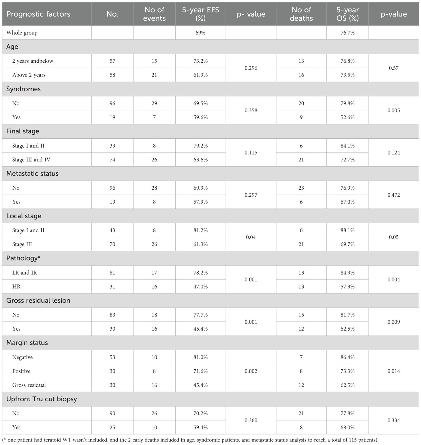 Results: In 115 eligible patients, median age was 31.5 months (range 3 month – 9 years). Male to female ratio was 1:1.67. Abdominal mass was the most common presentation (69.5%). At the end of the study, 5-year EFS and OS were 69% and 76.7%. Patients with high-risk pathology had the worst prognosis regarding EFS and OS, keeping its significance in uni- and multivariate analyses as the factor with highest hazard ratio (HR = 2.931, 95% CI 1.366 - 6.289 p 0.006). Out of 29 events related to the disease, 21 included local progression/relapse (72.5%), and 8 lung progression/relapse (27.5%). The incidence of ESRD was 6.9% (8 patients).