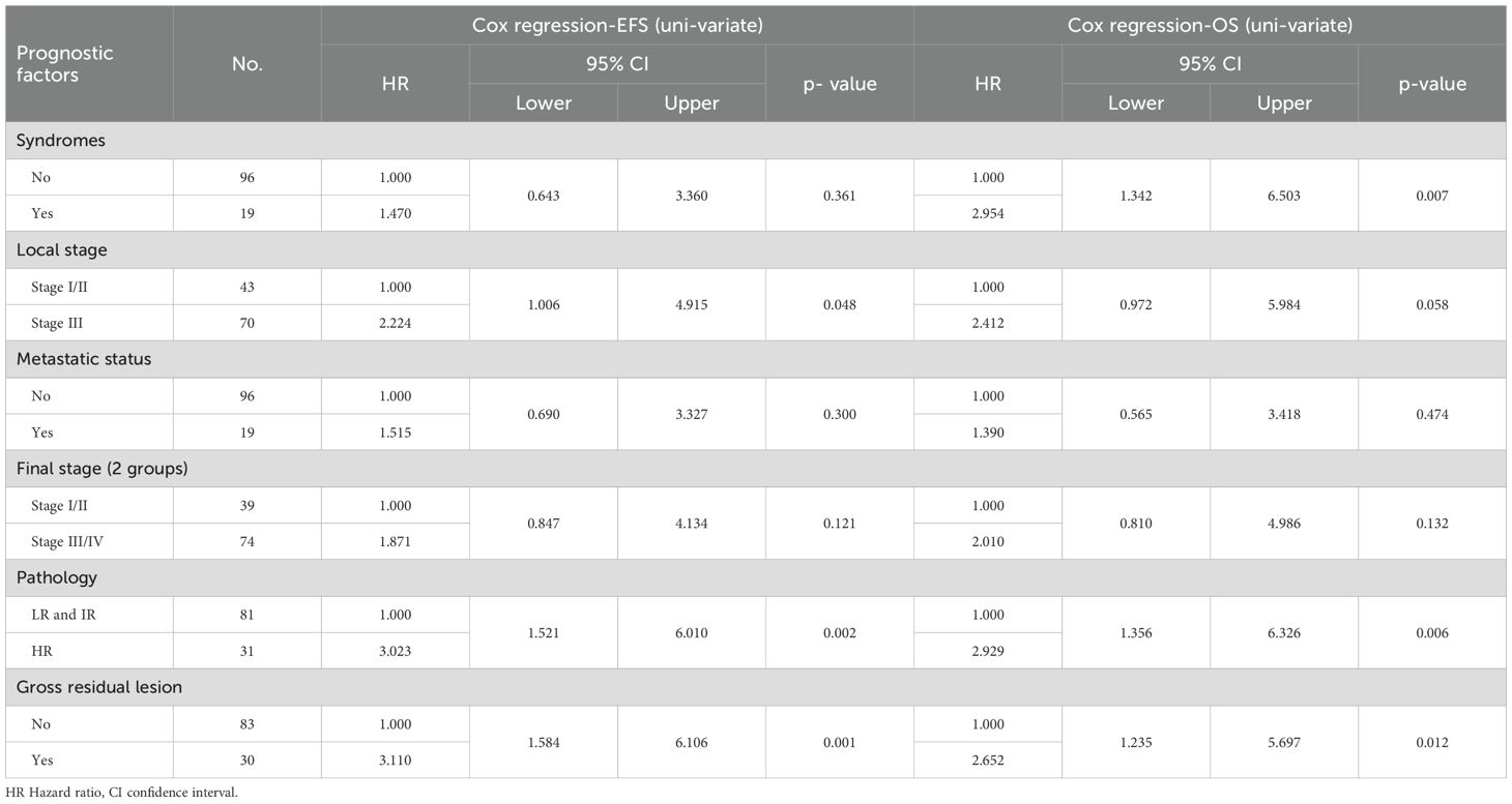 Statistical analysis was done using IBM SPSS® Statistics version 22 (IBM® Corp., Armonk, NY, USA). Numerical data was expressed as mean, standard deviation, and median. categorical data was expressed as frequencies and percentages. Survival analysis was done using Kaplan-Meier method and Log rank test was used in comparing survival rates. Hazard Ratios (95% CI) were calculated through univariate and multivariate Cox regression modeling to examine the relationships between the survival and different covariates; syndromic features (yes/no), residual (yes/no), microscopic margin (yes/no), metastatic status (present/absent), local stage (I&II/III), final stage (I&II/III&IV), pathology (LR&IR/HR). A p-value < 0.05 was considered significant throughout the analysis.