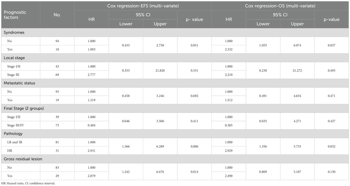 Patients with postoperative gross residual disease demonstrated significantly reduced 5-year EFS and OS compared to those without residual disease (EFS: 45.4% vs. 77.7%, p 0.001; OS: 62.5% vs. 81.7%, p 0.009) (Figure 5). Univariate and multivariate analyses identified gross residual disease as an independent predictor of poorer EFS (Hazard ratio = 2.879, 95% CI: 1.242–6.676, p 0.014), though this association did not retain statistical significance for OS (Hazard ratio = 2.490, 95% CI: 0.809–5.187, p 0.13).