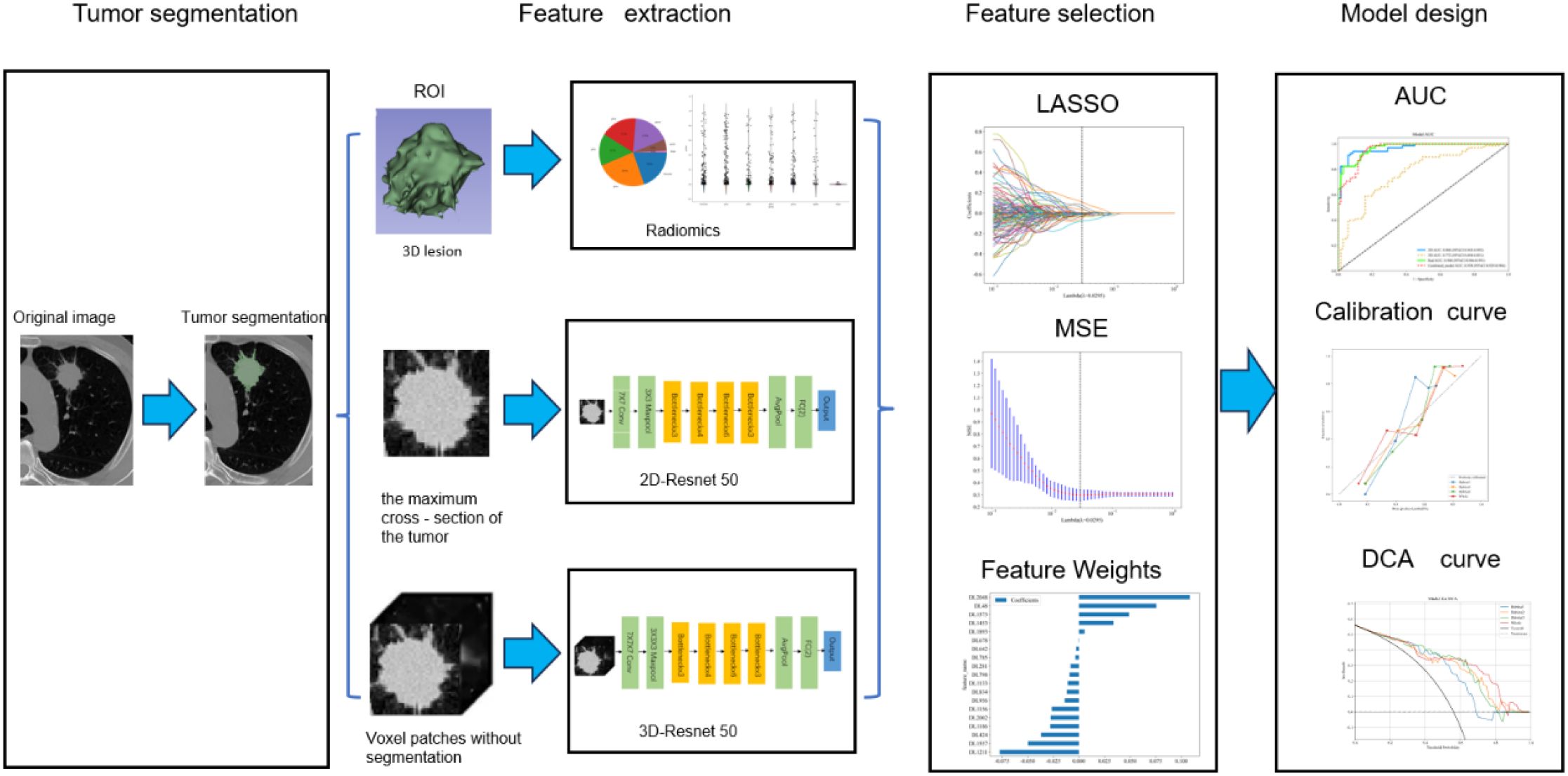 Radiomics, as a robust imaging biomarker, can non-invasively assess tumor heterogeneity that is not detectable by the human eye and can reflect intratumoral angiogenesis (10). Several studies have applied radiomic and related combined models to predict LVI status in NSCLC, achieving promising results (11–13). With the rapid development of deep learning (DL), DL features have complemented traditional radiomic features in medical imaging (14). DL imaging features extracted based on convolutional neural networks (CNN) are used to construct feature signatures and have been shown to enhance model performance in various clinical tasks (15). DL has been widely applied in NSCLC research, including lung nodule classification, lung cancer metastasis prediction, gene mutation prediction, airspace dissemination prediction, and treatment efficacy assessment (16–20).