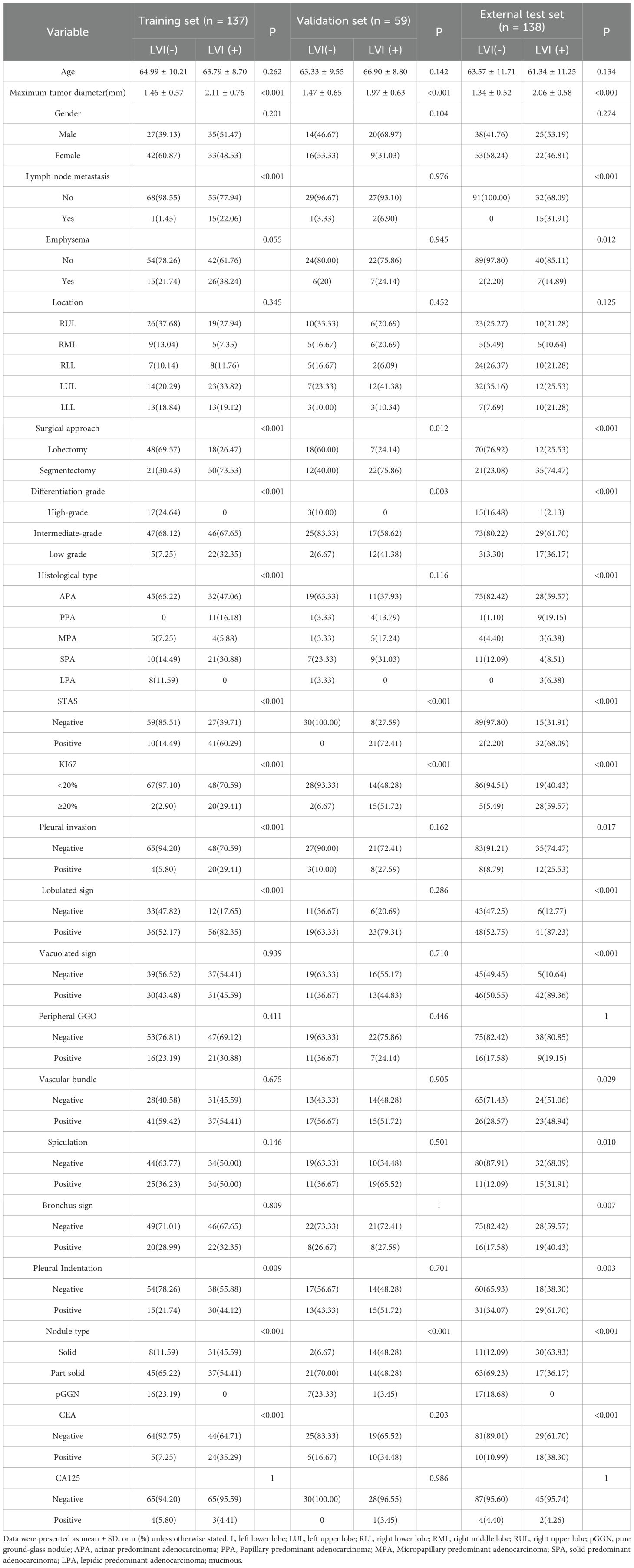 This study included a total of 334 patients with clinical T1 stage invasive lung adenocarcinoma, comprising 137 patients in the training set (68 LVI-positive and 69 LVI-negative), 59 patients in the internal validation set (29 LVI-positive and 30 LVI-negative), and 138 patients in the external testing set (48 LVI-positive and 90 LVI-negative). Patient clinical data, CT characteristics, and pathological information were recorded. The clinical baseline characteristics of all patients are presented in Table 1.