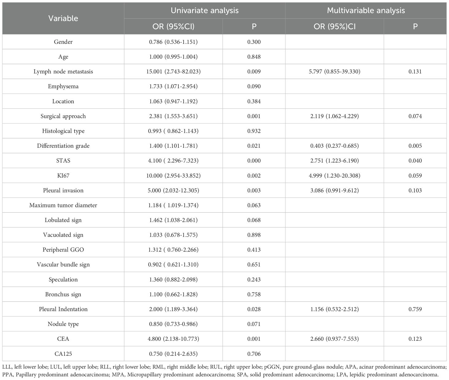 Univariate and multivariate analyses were performed on the clinical characteristics of the training set, and the odds ratios (OR), along with their corresponding p - values, were calculated for each feature (Table 2). In the multivariate analysis: For pathological grading, the OR was 0.403, with a 95% confidence interval (CI) of 0.237 - 0.685 and P = 0.005. For STAS, the OR was 2.751, with a 95% CI of 1.223 - 6.190 and P = 0.040. Only pathological grading and STAS were significant (P < 0.05), serving as independent predictors of LVI.