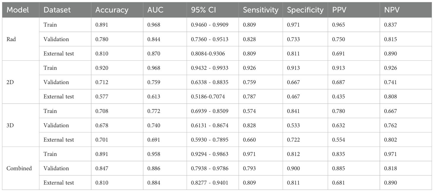 External test set: The combined model (0.884, 95%CI: 0.8277-0.9401) and the traditional radiomics model (0.870, 95%CI: 0.8084-0.9306) maintained stable performance, while the performance of the 2D DL model decreased significantly (0.613, 95%CI: 0.5186-0.7074), suggesting its weak cross-center generalization ability (Table 3).