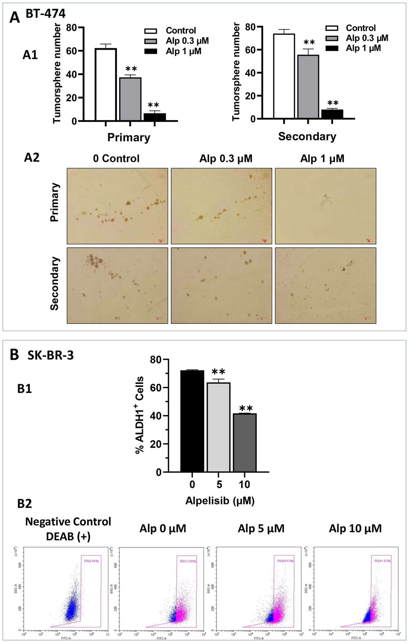 Figure 2. Alpelisib inhibits stemness activity in both SK-BR-3 and BT-474 cells. (A) Effect of alpelisib on tumor sphere formation in BT-474 cells. A1. BT-474 cells were seeded in low-attachment 24-well plates at a density of 1, 000 cells/well and treated with various concentrations of alpelisib (0, 0.3, 1 μM) for 7 days. Spheres > 40 μm in diameter were counted and statistically analyzed. Secondary sphere formation was assessed using single cells derived from primary spheres after trypsinization. The experiments were performed in triplicate. The representative images of primary tumorspheres are shown in A2. ** p < 0.01 (indicated group vs. the untreated control). (B) Effect of alpelisib on ALDH1 activity in SK-BR-3 cells. B1. SK-BR-3 cells were treated with different concentrations of alpelisib (0, 5, 10 μM) for 3 days. ALDH1 activity was measured with the ALDEFLUOR assay using flow cytometry. Representative plots of the ALDH1+ cell gating are shown in B2, and the percentages of ALDH1+ cells are quantified using one-way ANOVA followed by Tukey’s post-hoc test for multiple comparisons (** p < 0.01) (indicated group vs. the untreated control).