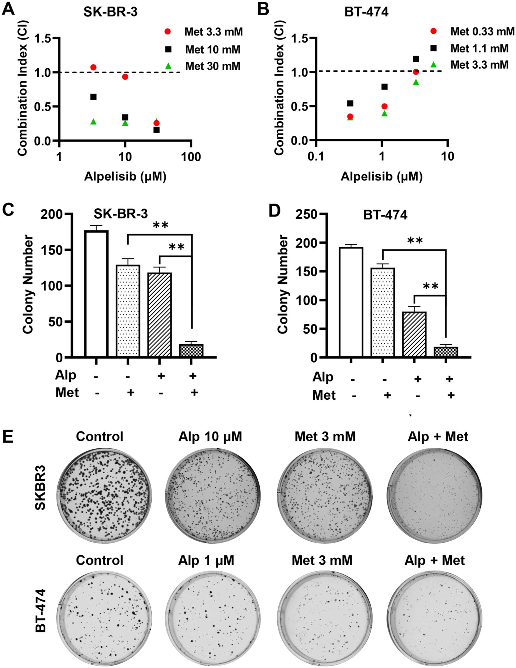 Figure 3. Metformin synergistically enhances alpelisib-induced inhibition of proliferation and colony formation in SK-BR-3 and BT-474 cells. A and (B) Combination index (CI) analysis of SK-BR-3 (A) and BT-474 (B) cells treated with alpelisib (Alp) and metformin in various combinations. Cells were treated with the indicated drug concentrations for 5 days, and survival fractions were measured using CCK-8 assays. CI values were calculated using CompuSyn software based on the Chou-Talalay method. C & (D) Clonogenic assays of SK-BR-3 (C) and BT-474 (D) cells treated with alpelisib, metformin, or their combination at the indicated concentrations for 14 days. Colonies were stained with crystal violet and quantified. ** p < 0.01 (combination vs. single-agent). (E) Representative images of clonogenic assays for SK-BR-3 and BT-474 cells with indicated treatments.