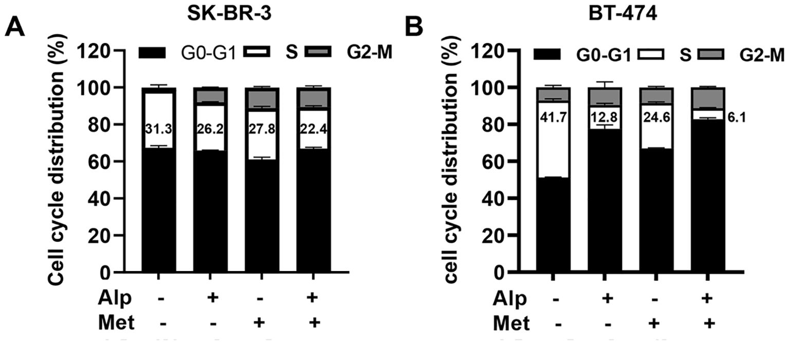 Figure 4. Combination of alpelisib and metformin enhances cell cycle arrest in SK-BR-3 and BT-474 cells. (A) SK-BR-3 cells were treated with 3 μM alpelisib, 5 mM metformin or their combination for 24 hours. (B) BT-474 cells were treated with 0.33 μM alpelisib, 1 mM metformin, or their combination for 24 hours. Treated cells were harvested and analyzed for cell cycle distribution using flow cytometry in triplicate. The percentages of cells in each phase of the cell cycle were calculated using MODFIT software, with the percentages of cells in the S phase highlighted.