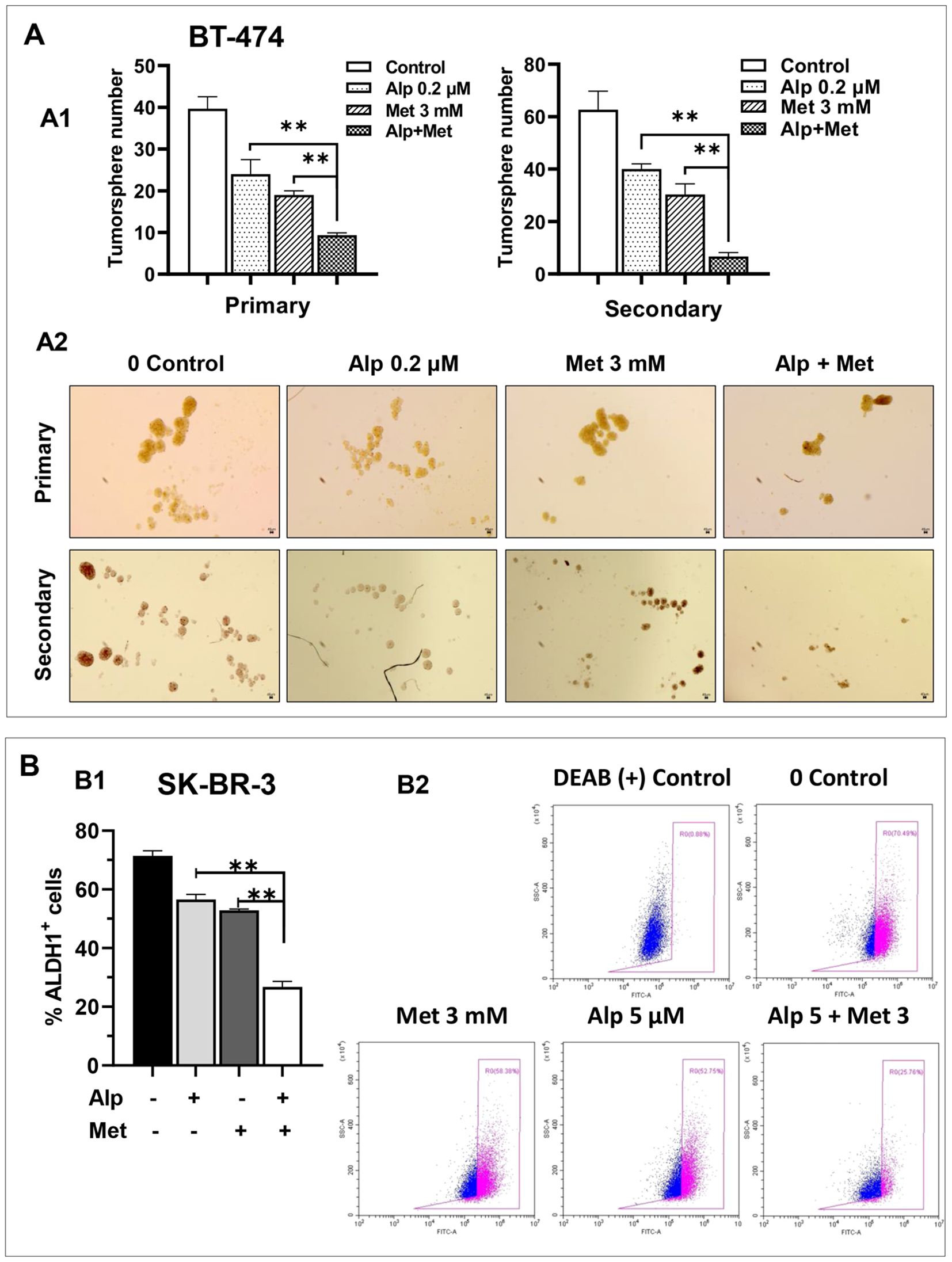 Figure 5. Metformin enhances alpelisib-induced inhibition of stemness in SK-BR-3 and BT-474 cells. (A) Effect of alpelisib and metformin on tumor sphere formation in BT-474 cells. A1. For primary sphere formation, BT-474 cells were seeded in low-attachment 24-well plates at 1, 000 cells/well and treated with 0.2 μM alpelisib, 3 mM metformin, or their combination for 7 days. Spheres >25 μm in diameter were counted and statistically analyzed. Secondary sphere formation was assessed using single cells derived from primary spheres after trypsinization. The experiments were performed in triplicate. ** p < 0.01 (combination vs. single-agent). A2. Representative images of primary and secondary spheres as described in A1. (B) Effect of alpelisib and metformin on ALDH1 activity in SK-BR-3 cells. B1. SK-BR-3 cells were treated with 5 μM alpelisib, 3 mM metformin, or their combination for 48h. ALDH1 activity was analyzed using the ALDEFLUOR assay with flow cytometry. Based on DEAB-treated negative controls, ALDH1+ cell populations were quantified. Data in triplicate were analyzed using one-way ANOVA followed by Tukey’s post-hoc test for multiple comparisons (** p < 0.01) (combination vs. single-agent). B2. Representative flow cytometry histograms of ALDEFLUOR assays described in B1.