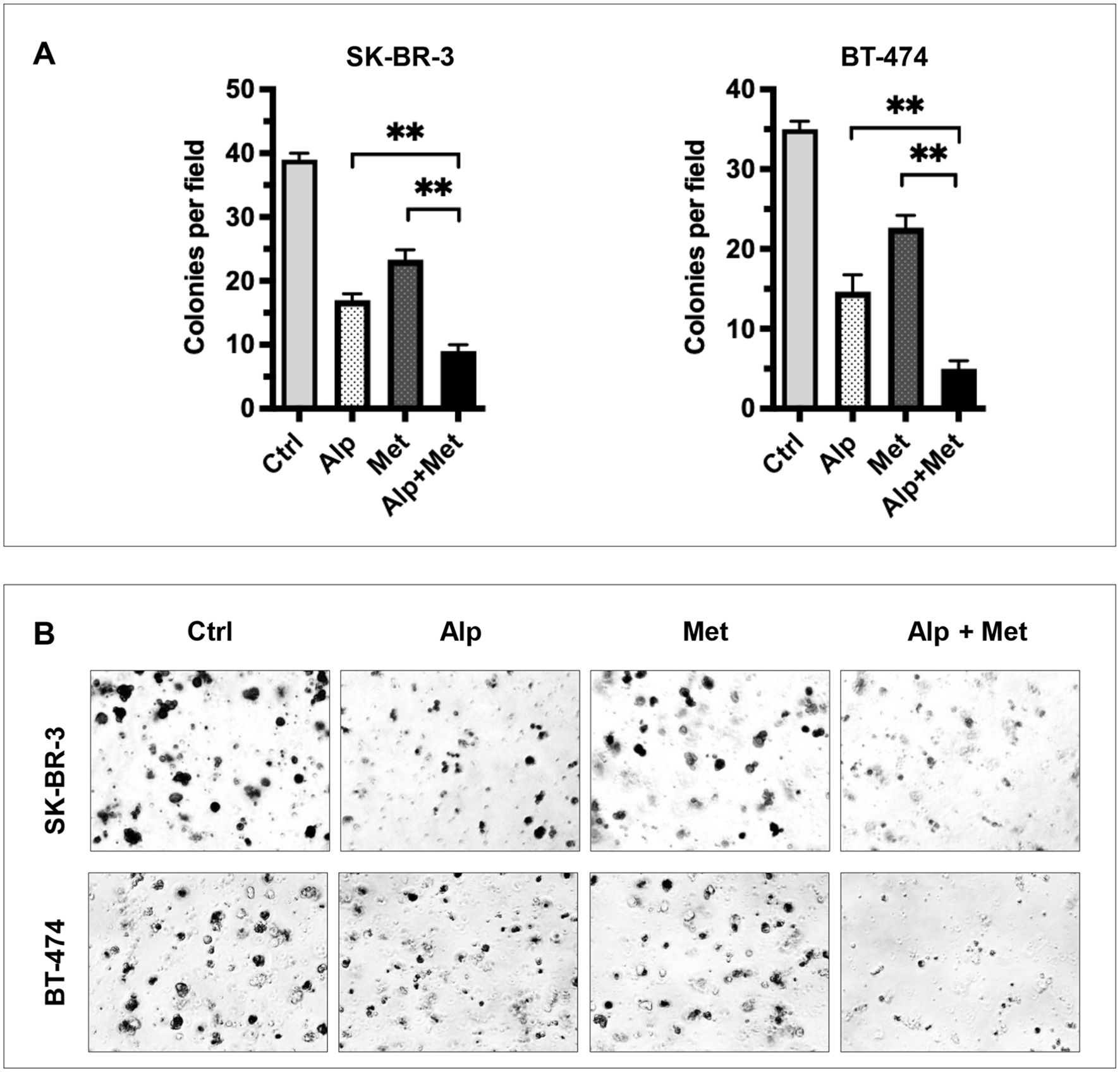 Figure 6. Metformin enhances alpelisib-induced inhibition of anchorage-independent growth in SK-BR-3 and BT-474 cells. SK-BR-3 and BT-474 cells were treated with 2 μM alpelisib (Alp), 3 mM metformin (Met), or their combination (Alp + Met) in 3D Matrigel culture for 14 days. (A) Quantified colony counts. Colonies with a diameter ≥25 μm were counted, and data are presented as the mean ± SD from three independent experiments. Statistical significance was determined by one-way ANOVA with Tukey’s post hoc test (**p < 0.01, combination vs. single-agent). (B) Representative images of 3D colonies in each cell line under the indicated treatment conditions.