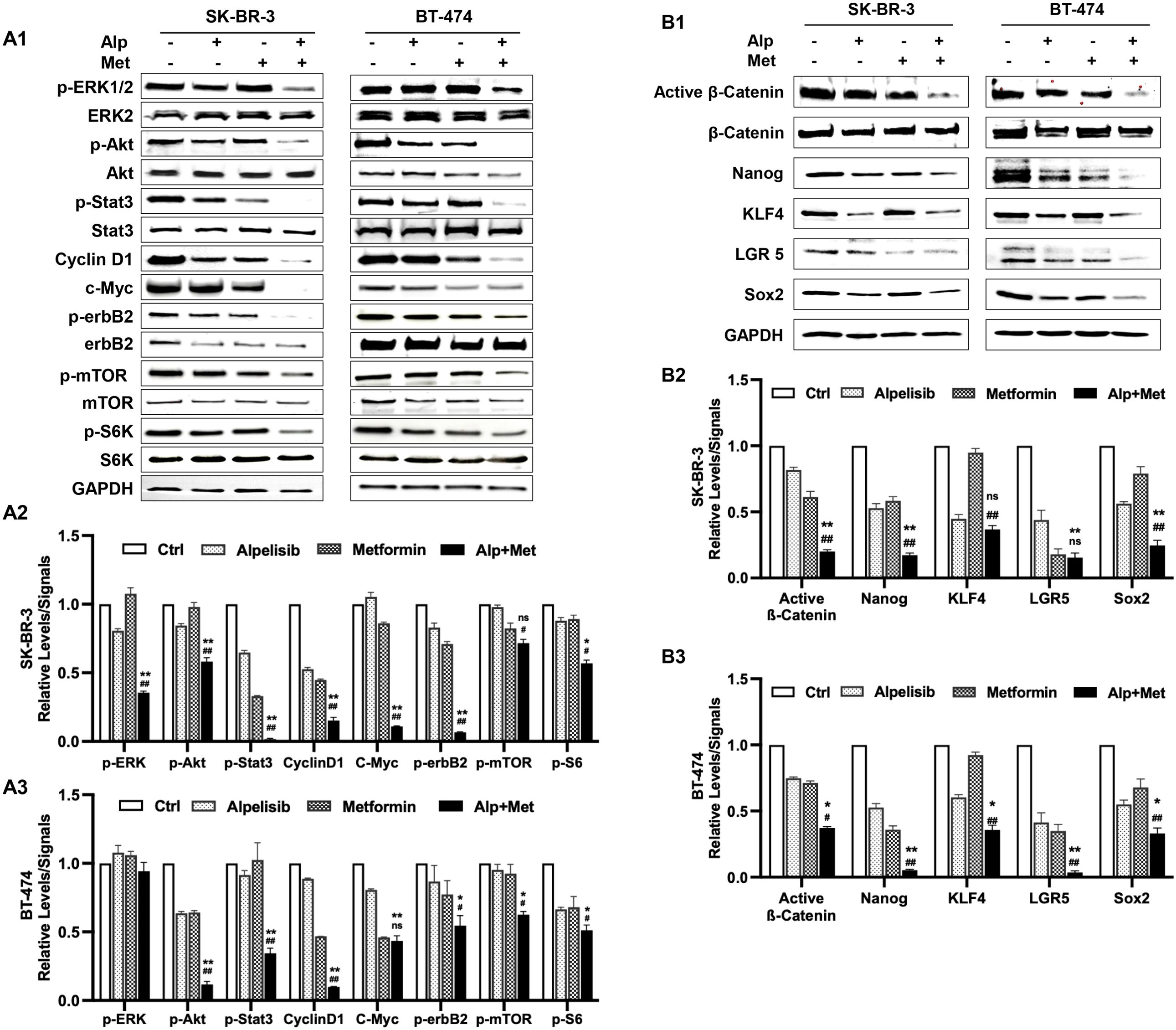 Figure 7. Metformin enhances alpelisib-induced inhibition of receptor tyrosine kinase signaling and stemness regulators in SK-BR-3 and BT-474 cells. SK-BR-3 cells were treated with 3.3 μM alpelisib, 5 mM metformin, or their combination for 48 hours. BT-474 cells were treated with 1.1 μM alpelisib, 1.1 mM metformin, or their combination for 48 hours. The treated cells were collected for protein extraction, followed by Western blot analysis to detect the relative levels of total or phosphorylated (p-) proteins of the indicated markers. (A) Effects of the alpelisib–metformin combination on receptor tyrosine kinase (RTK) pathway components (ERK, Akt, Stat3, Cyclin D1, erbB2, mTOR, S6K). (B) Effects of the alpelisib–metformin combination on the expression/activation of key stemness markers (β-catenin, Nanog, KLF4, LGR5, Sox2). A2/A3 and B2/B3 show the quantified data derived from A1 and B1, respectively. For quantification in each panel, Western blot band intensities were quantified using ImageJ and normalized to the indicated loading controls. Phosphorylated protein levels were further normalized to the corresponding total protein levels. Quantified data represent the mean of three independent experiments. */# p < 0.05; **/## p < 0.01; ns, not significant. */** Combination (Alp + Met) vs. alpelisib; #/## Combination vs. metformin.