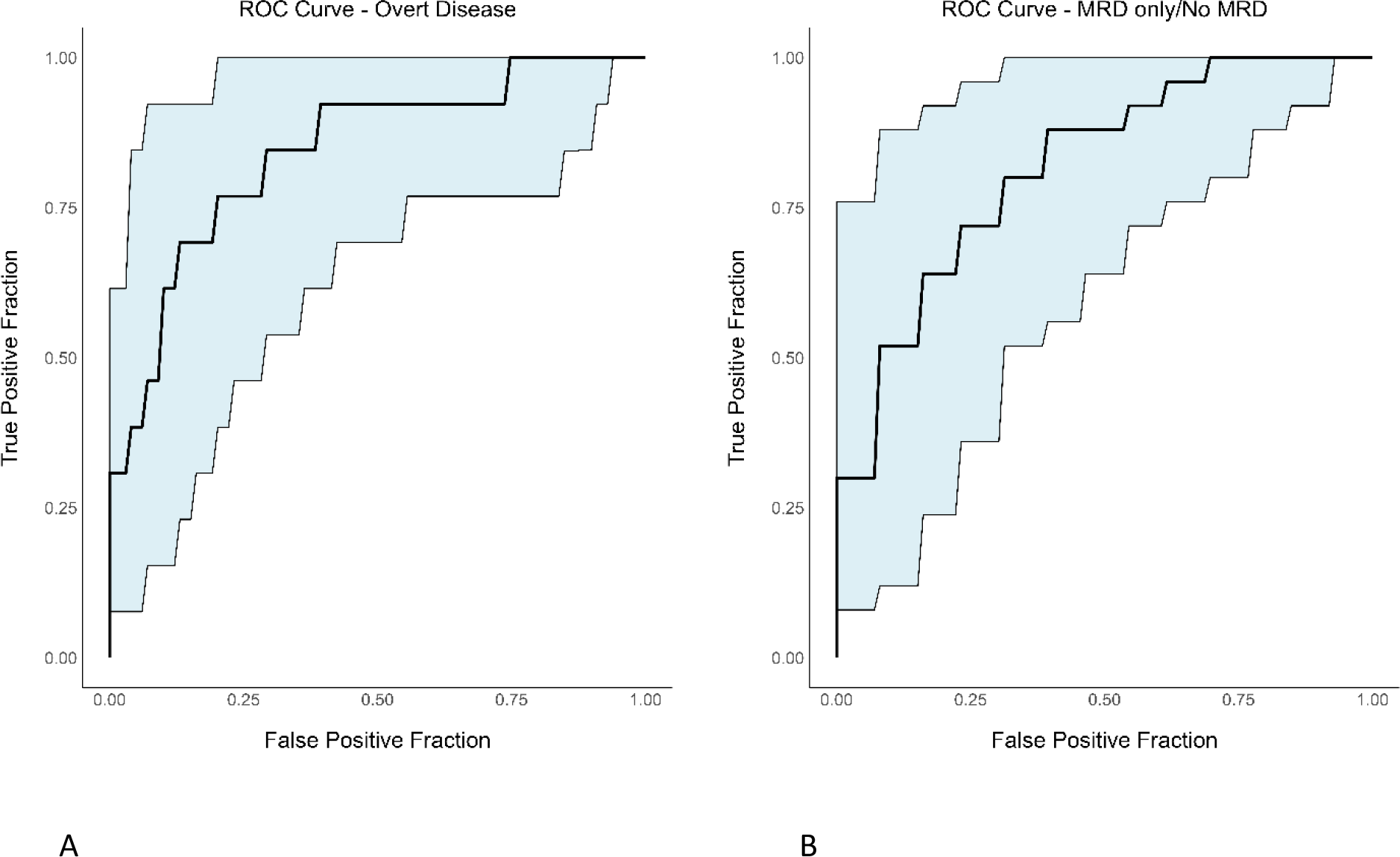 ROC curves with confidence intervals evaluating the performance of prediction models for BM overt disease and MRD only/No MRD using serum sBCMA. (A) BM overt disease (B) BM MRD only/No MRD.