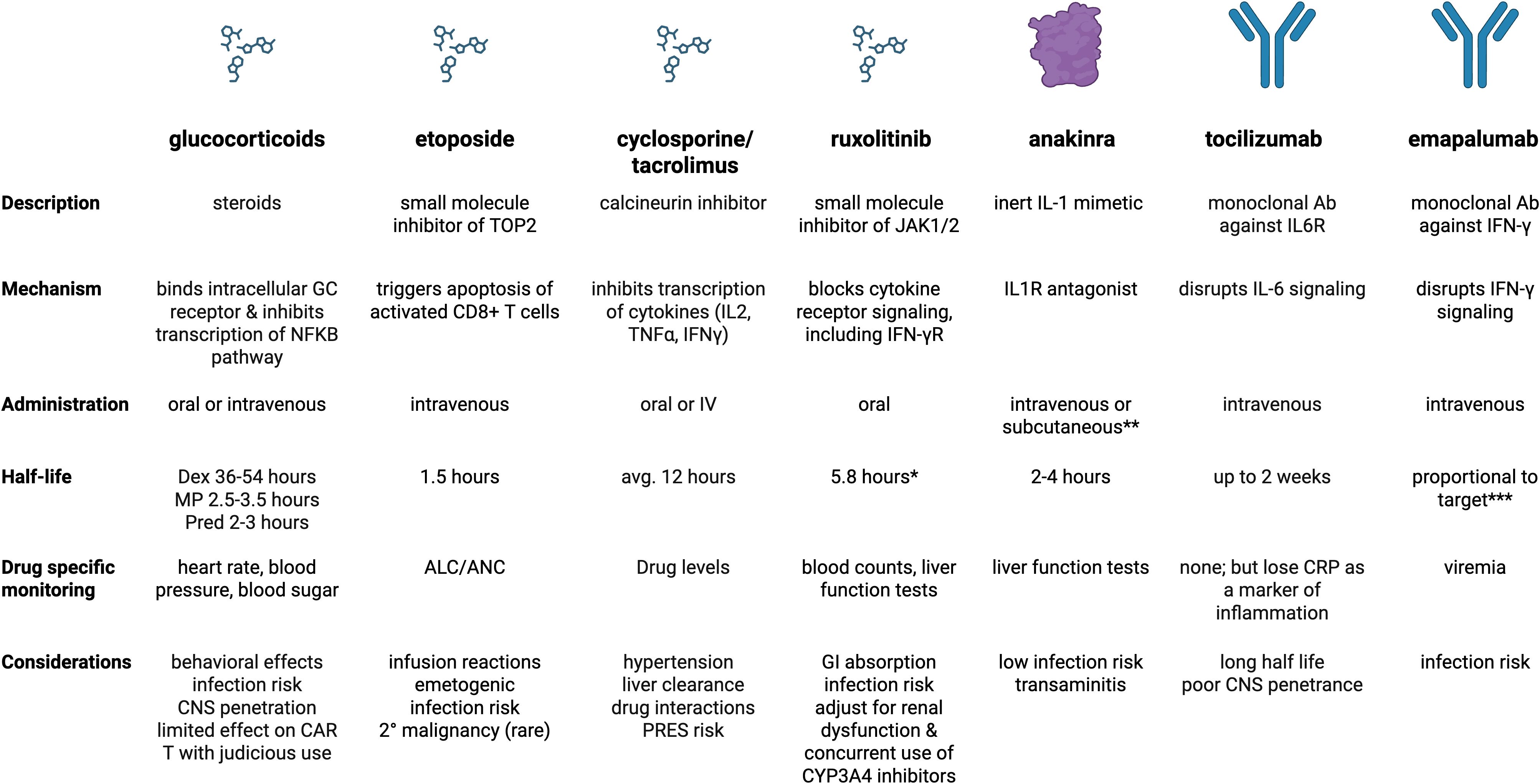 Figure 4. Summary of medications core to management of primary and secondary HLH. *includes ruxolitinib and active metabolites **subcutaneous form used more for outpatient management of sJIA ***clearance is proportional to total serum IFN-γ concentration when it is > 10,000 pg/mL (constant elimination if less). Created in BioRender. Dex, dexamethasone; MP, methylprednisolone; Pred, prednisone