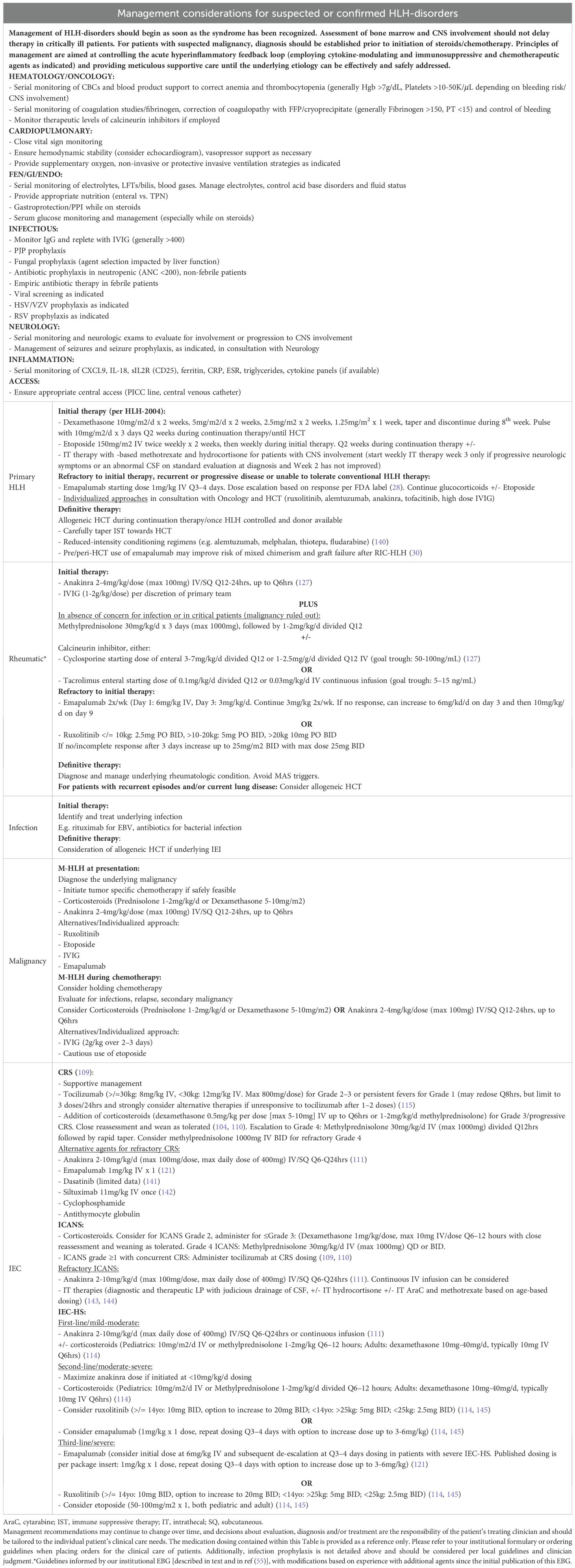 Medical management targeting cytokine production and hyperactive immune cells may quell HLH and prevent its recurrence. However, when there is a strong genetic predisposition and/or a chronic underlying disorder, allogeneic hematopoietic cell transplantation (HCT) may be required for definitive treatment. The longstanding experience of cell therapy physicians in HLH management has been instrumental. Additionally, given the illness acuity of patients with HLH and HLH-like syndromes, physicians caring for these patients almost always include those in critical care medicine. Intensivists must balance treating multi-organ dysfunction and immune dysregulation in the context of a patient’s primary disorder. This results in overlapping but unique multidisciplinary management considerations in collaboration with HCT/Cellular therapy, Oncology, Neurology, Rheumatology, Immunology, and Infectious Disease specialists. Here we describe the different causes of HLH and HLH-like syndromes, as well as the role of medical management and HCT.