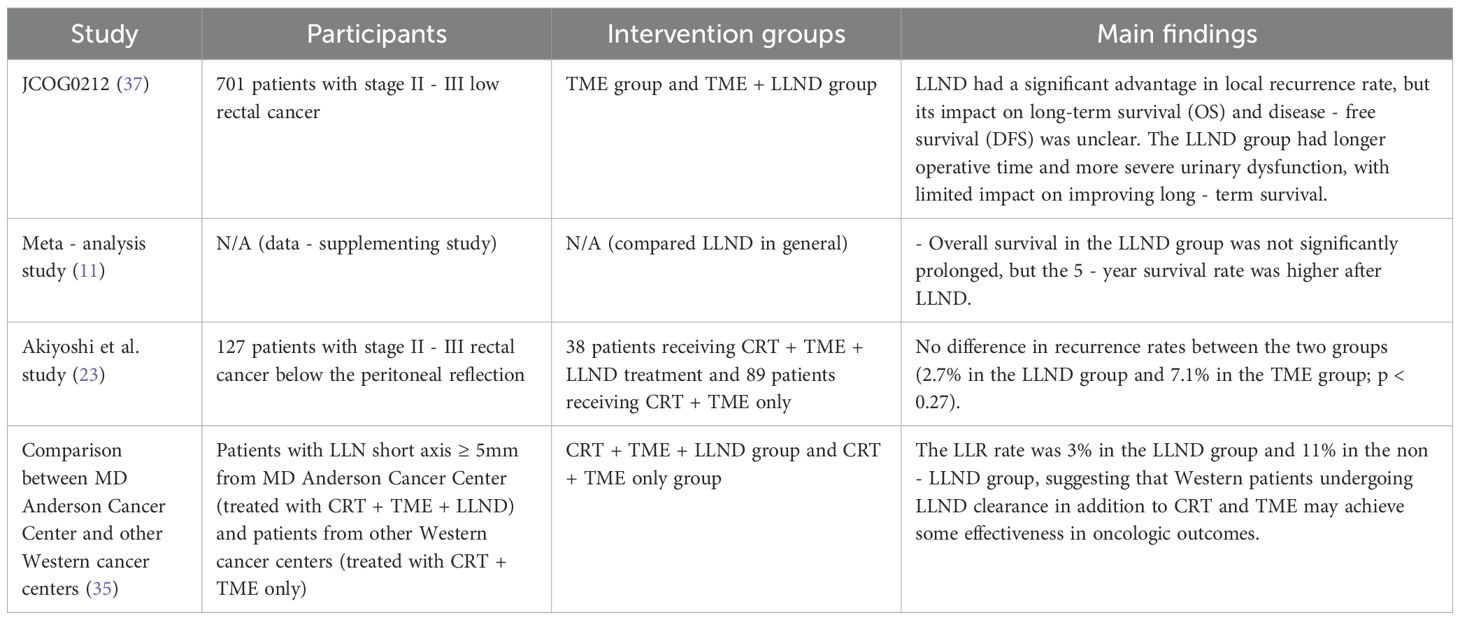 In Australia and the United States, patients with an LLN short axis of 5 mm from the MD Anderson Cancer Center in Houston, Texas, who received CRT + TME + LLND were compared with patients from other Western centers who received only CRT + TME. The results showed that the LLR rate was 3% in the LLND group and 11% in the non-LLND group, indicating that Western patients who undergo LLND in addition to CRT and TME may also achieve improved oncological outcomes (35).