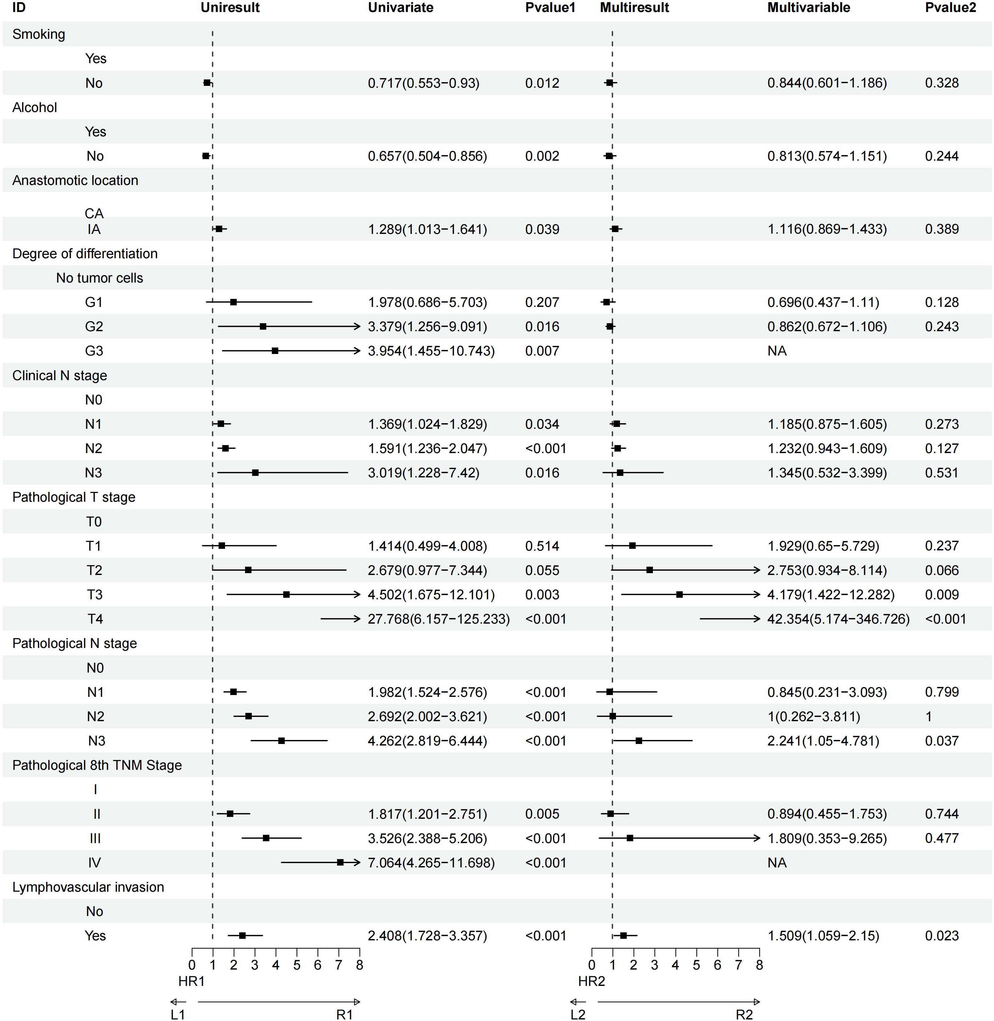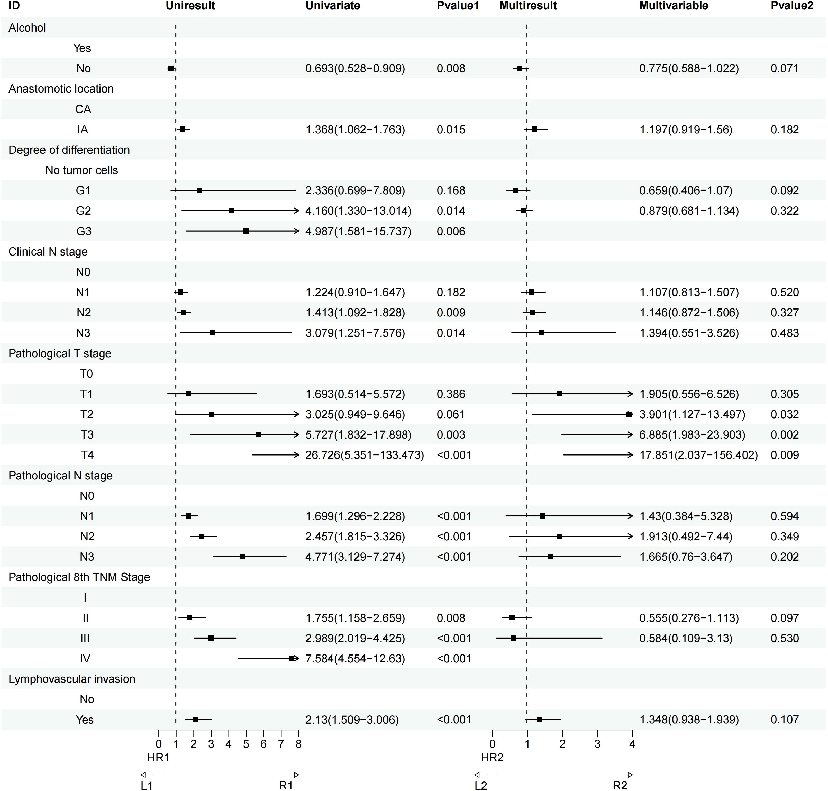 Univariate analysis revealed that factors such as a history of heavy drinking, anastomotic location, degree of tumor differentiation, clinical N stage, pathological T and N stages, pathological TNM stage, and lymphovascular invasion significantly influenced OS. Further multivariate Cox regression analysis identified pathological T3 stage (P = 0.002) and pathological T4 stage (P = 0.009) as the most critical determinants of OS (Figure 3). Similarly, univariate analysis demonstrated that smoking history, heavy drinking, anastomotic location, tumor differentiation, clinical N stage, pathological T and N stages, pathological TNM stage, and lymphovascular invasion were significant factors affecting DFS. Multivariate Cox regression further highlighted that pathological T3 stage (P = 0.009), pathological T4 stage (P<0.001), pathological N3 stage (P = 0.037), and lymphovascular invasion (P = 0.023) were the most influential prognostic factors for DFS (Figure 4).