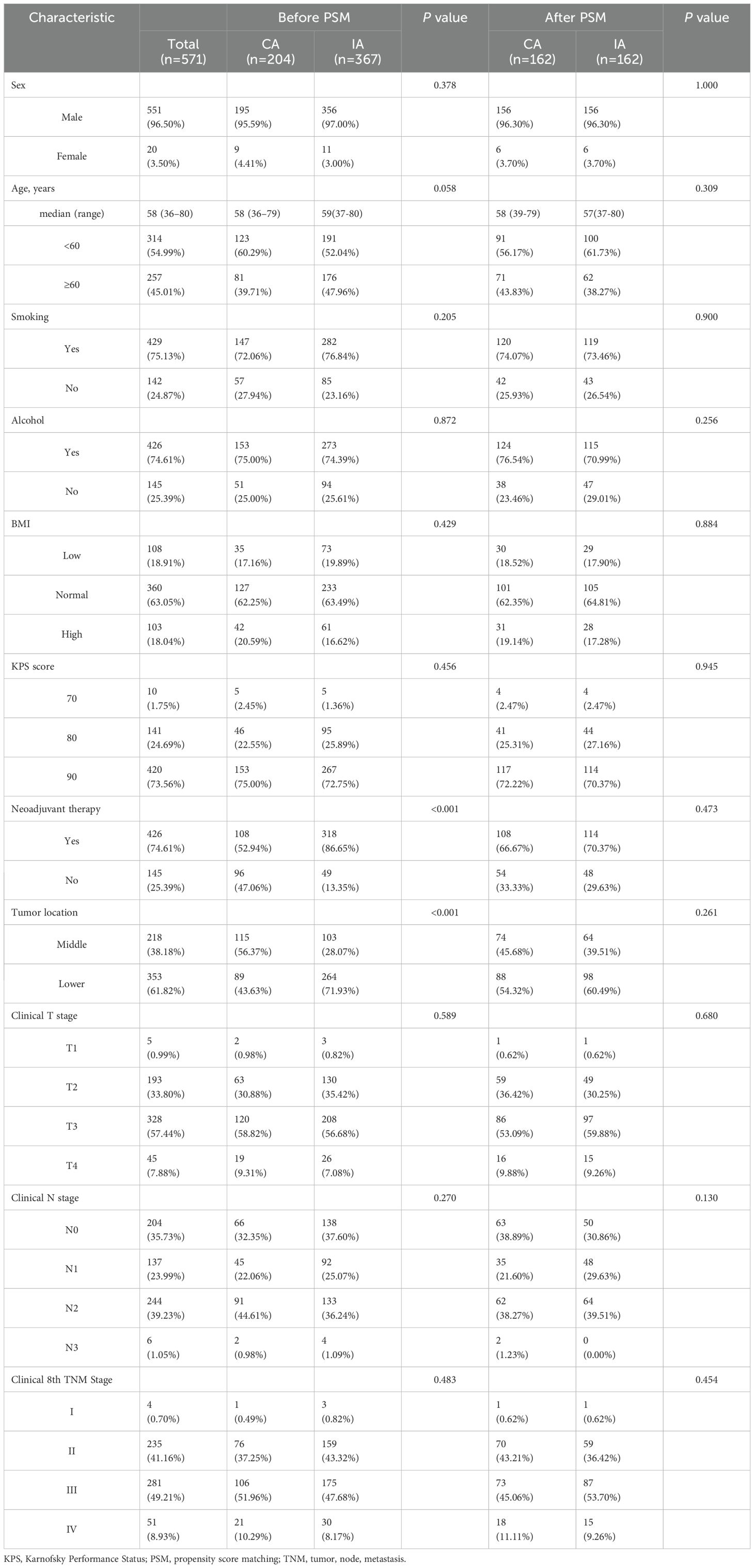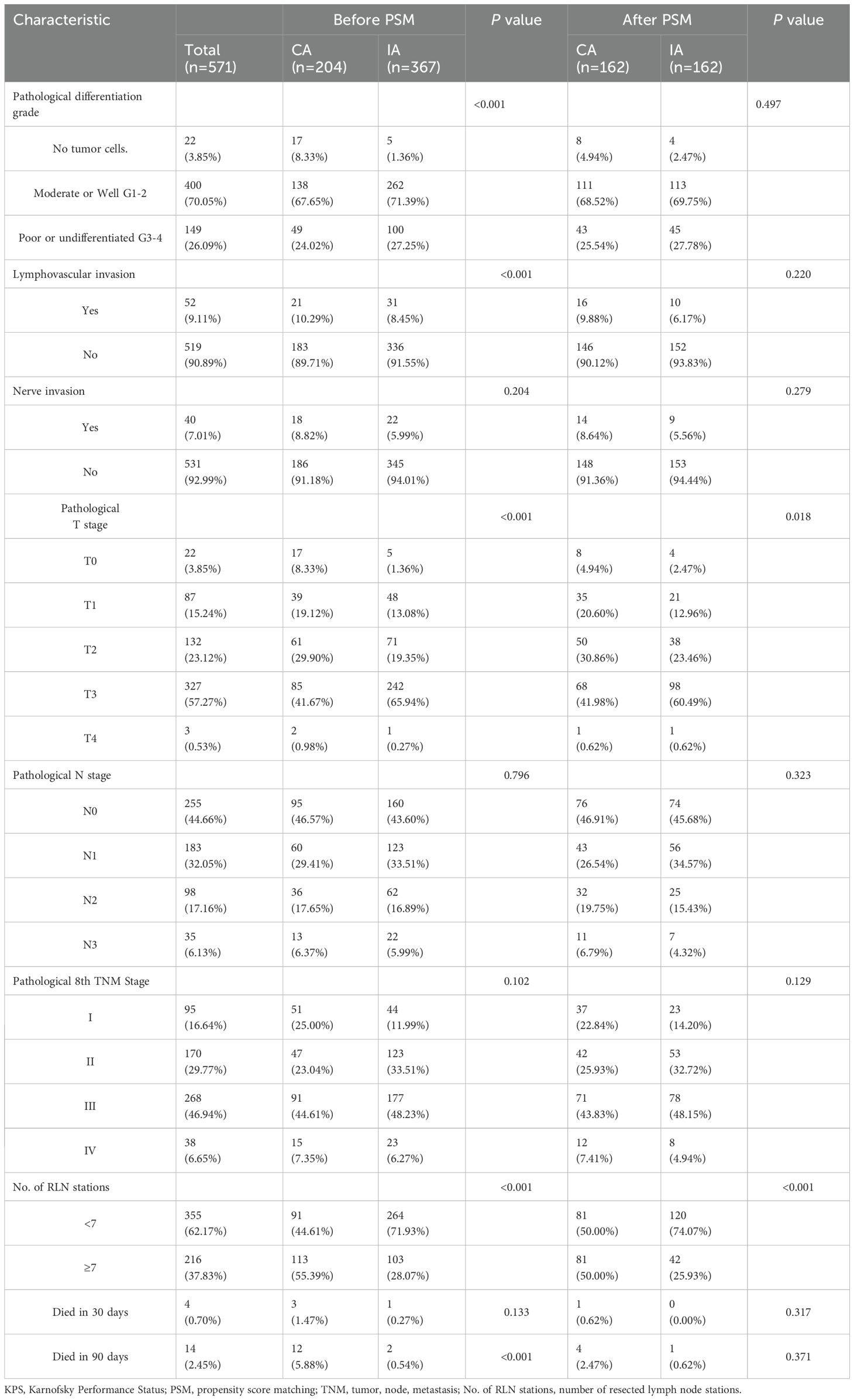 A total of 571 patients who met the inclusion criteria were analyzed in this study (Figure 1). Among the included patients, 551 (96.50%) were male, and 20 (3.50%) were female. The age distribution showed that 314 patients (54.99%) were below 60 years, while 257 patients (45.01%) were aged 60 years or older. A significant proportion of the cohort had histories of smoking (429 patients, 75.13%) and heavy drinking (426 patients, 74.60%). In terms of clinical TNM staging, 332 patients (58.14%) were classified as stage III or IV, and 426 (74.60%) underwent neoadjuvant therapy prior to surgery (Table 1). Postoperative pathological findings revealed that 149 patients (26.09%) had tumors graded as poor or undifferentiated (G3-4). Lymphovascular invasion was observed in 52 patients (9.10%), and nerve invasion was present in 40 patients (7.01%). Pathological TNM staging identified 306 patients (53.60%) in stage III or IV, consistent with the advanced stage of the disease in the majority of the cohort (Table 2). Significant differences were observed between the CA and IA groups regarding the extent of lymph node stations dissection. Specifically, the number of patients with more than seven lymph node stations dissected was significantly higher in the CA group compared to the IA group (p < 0.001). However, no significant differences were found between the CA and IA groups in terms of short-term postoperative mortality, including deaths within 30 days (p = 0.405) or 90 days (p = 0.382) post-surgery (Table 2).
