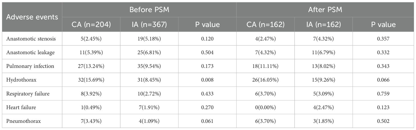 The results of short-term outcomes indicate that, except for Hydrothorax, there were no significant differences between the groups before and after Propensity Score Matching (PSM). Before PSM, 32 patients (15.69%) in the CA group and 31 patients (8.45%) in the IA group developed Hydrothorax (P = 0.008), with the CA group showing a significantly higher rate of Hydrothorax compared to the IA group. After PSM, although the difference decreased (P = 0.066), the CA group still had a higher incidence of Hydrothorax compared to the IA group (26 patients, 16.05% vs. 15 patients, 9.26%) (Table 3).