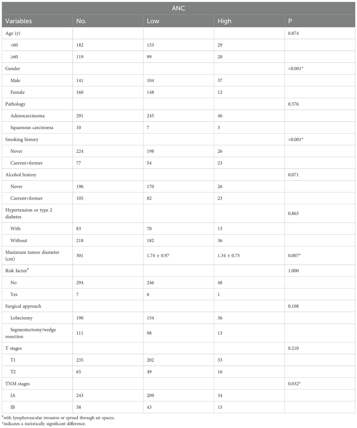 Results: Among the tested peripheral blood cell fractions, only ANC was found to be a significant factor in predicting DFS (P = 0.011) and OS (P=0.043). The ANC displayed a positive correlation with other fractions, including the absolute lymphocyte count (R=0.26, P<0.001), absolute monocyte count (R=0.56, P<0.001), and platelet count (R=0.29, P<0.001). With a cutoff at 3879/mm3, 83.72% (252/301) of patients were divided into ANC-low and 16.28% (49/301) into ANC-high. Patients in the ANC-low group also presented a superior DFS (log rank=8.64, P = 0.003) and OS (log rank=9.86, P = 0.002) than those in the ANC-high group; however, the ANC level was not validated as an independent prognostic factor for both DFS and OS.
