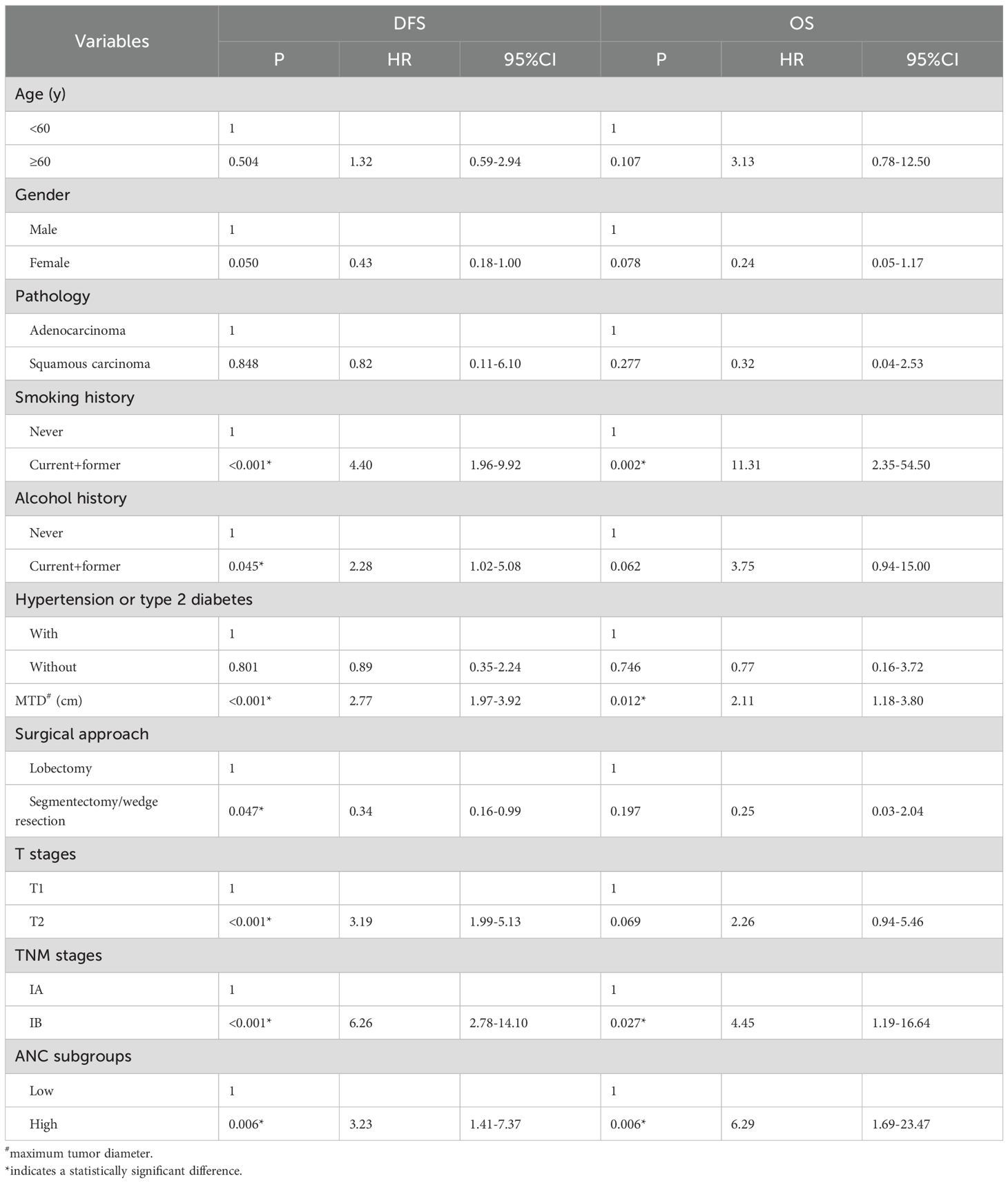 Methods: A retrospective study was conducted in CEA normal stage I NSCLC patients. The prognostic value of peripheral blood cell fractions, including the absolute neutrophil count (ANC), was tested, and the differences in clinical features among the ANC-low or ANC-high subgroups were checked. The disease-free survival (DFS) and overall survival (OS) differences in these subgroups were run by Kaplan–Meier analysis, and the risk factors for survival were validated by a Cox proportional hazards model.