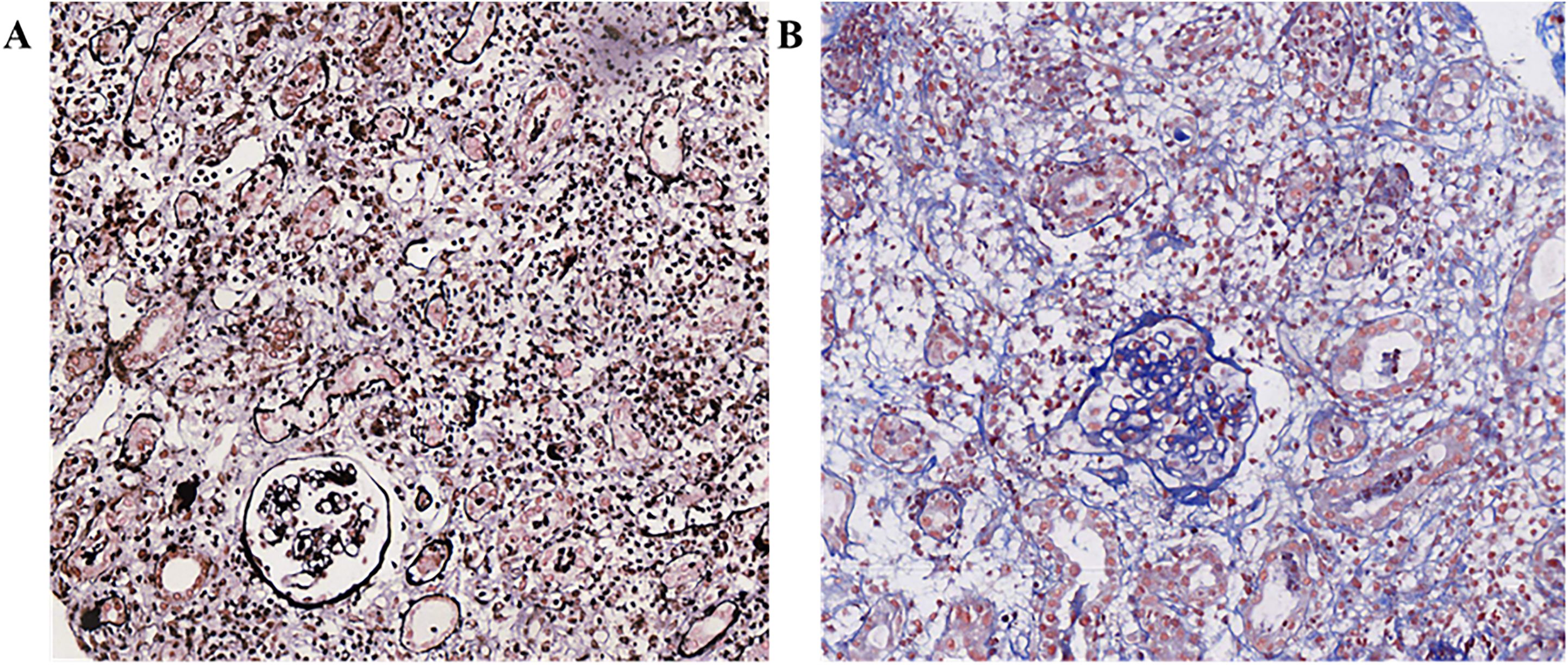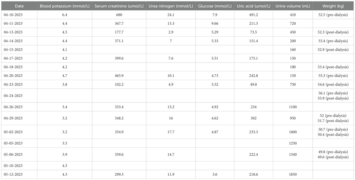 Diagnosis and treatment: On April 10, 2023, biochemical tests showed potassium 6.4mmol·L-1, creatinine 680.0 umol·L-1, urea 24.1mmol·L-1, uric acid 491.2umol·L-1. Due to the previous single cycle of sintilimab immunotherapy and clinical consideration of ICI-related kidney damage, the preliminary diagnosis was AKI stage 3 and hyperkalemia. According to the Common Terminology Criteria for Adverse Events (CTCAE) (1) version 5 and the Management of Immune-Related Adverse Events in Patients Treated with Immune Checkpoint Inhibitors: American The Clinical Practice Guidelines of the Society of Bed Oncology (2), the severity of kidney function abnormalities was graded 4. The urine volume on the same day was 410 mL, and continuous venous-venous hemodialysis filtration (CVVHDF) was carried out at 20:00 on April 10, 2023, and ended at 0:00 on April 13, 2023 (52 hours in total). The changes in the test indicators are shown in Table 1. On April 11, 2023, the patient’s appetite improved compared with a high potassium correction and type B sodium urine peptide precursor (NT-proBNP) 3570 ng·L-1. On April 12, 2023, the patient’s fatigue symptoms improved. On April 13, 2023, a kidney ultrasound showed 11.4×5.5 cm in the right kidney and 10.4×5.8 cm in the left kidney, and normal blood flow in both kidneys. Continuous venous-venous blood filtration treatment was carried out at 11:00 on April 14, 2023, and ended at 22:00 on April 15, 2023 (35 hours in total). On April 17, 2023, four premature renal injury tests showed urine microalbumin/creatinine 970.5 mg·g-1, α1 microglobulin/creatinine 403.7 mg·g-1, β2 microglobulin/creatinine 46.63 mg·g-1, and urine NAG/creatinine 72.4 U·g-1. There was no obvious edema on the patient’s body. The CVVHDF treatment was carried out at 11:00 on April 17, 2023, and ended at 12:00 on April 18, 2023 (25 hours in total). A kidney puncture biopsy was performed on April 18, 2023. On April 19, 2023, the patient had no lower back pain, no naked hematuria, and no nausea or vomiting. On April 20, 2023, the pathology of renal puncture (Figure 1) showed that the fluorescence was all negative, and 27 glomerulus (one glomerular sclerosis, two ischemic sclerosis, and the rest of the glomerular membrane cells and matrix mild proliferation) were observed under a light microscope. There was a loss of the brush border of the tubular cells. Renal interstitial edema, diffuse lymph cell, mononucleosis, and a small amount of eosinophil infiltration with fibrosis showed that interstitial invasive cells are CD3 (+), CD20 (scattered in +), and CD38 (scattered in +). The supplementary diagnosis was acute renal tubulointerstitial nephritis. Therefore, 40 mg IVGTT qd of methylprednisolone sodium succinate was administered (April 20, 2023–May 12, 2023). The CVVHDF treatment was began at 11:00 on April 20, 2023, and ended at 3:00 on April 23, 2023 (64 hours). On April 24, 2023, hemodialysis (HD) was filtrated for 4 hours. On April 26, 2023, the patient’s amount of urine increased, and dialysis was changed to HD three times a week for 4 hours each time (April 27–29, 2023). On May 2, 2023, the patient’s treatment was changed to HD twice a week for 4 hours each time (May 2–6, 2023). On May 8, 2023, before dialysis, the patient’s creatinine was stable at 350 umol·L-1, and the urine volume was acceptable. Dialysis was changed to once a week. HD was carried out for the last time once on May 9, 2023, for 3 hours and 20 minutes. On May 12, 2023, when the patient’s creatinine level was 299.3 umol·L-1, HD was stopped. The patient was prescribed prednisone acetate tablets (50 mg po qd) and discharged from the hospital.